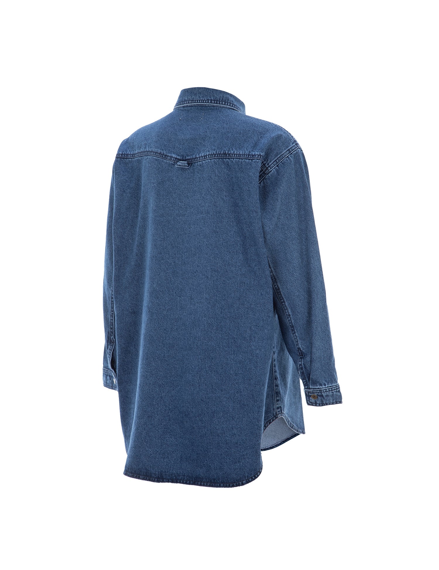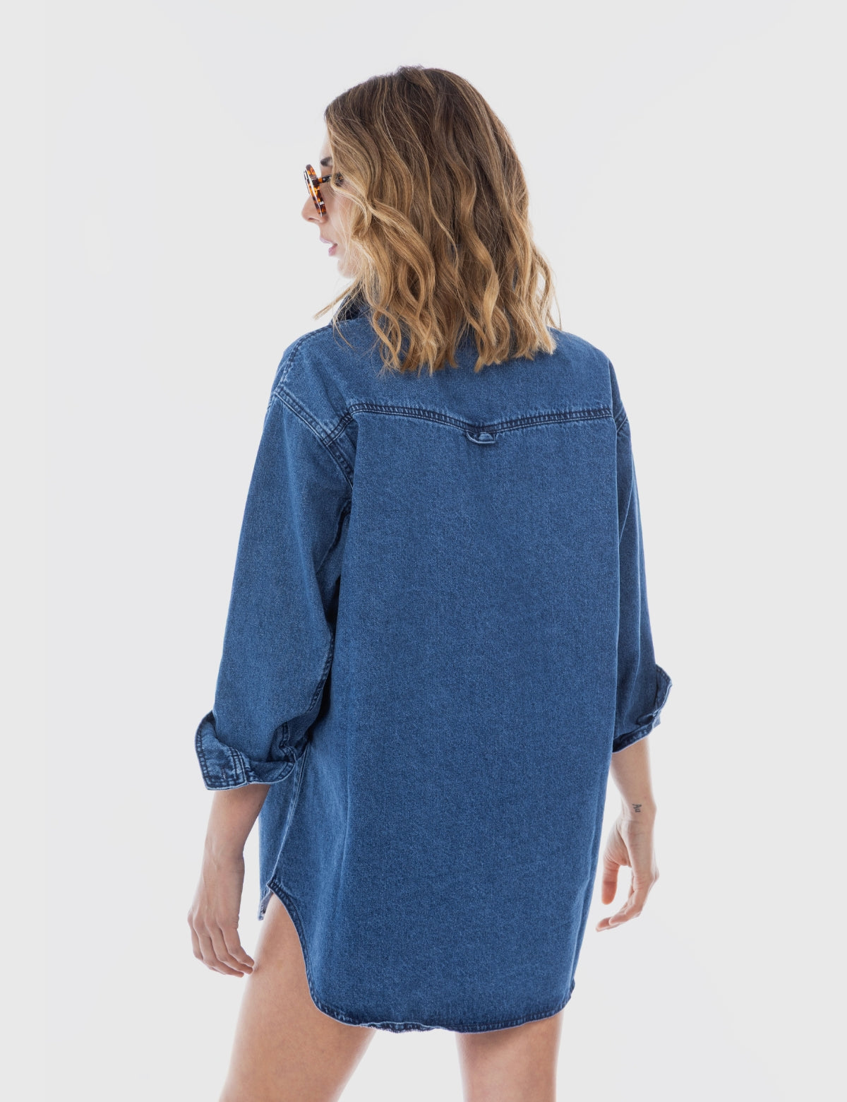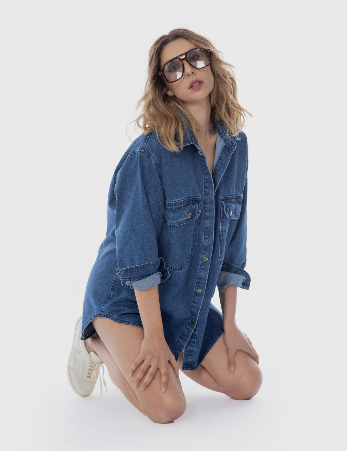 La camisa Carolina es una prenda fabricada en denim de algodón orgánico y con fibras recicladas. De diseño oversize y envolvente, hombro caído y detalle de bolsillos tipo parche de tamaño oversize con pequeño botón envejecido en cada tapeta. Esta camisa es ideal para usarla como sobre todo o también como vestido complementando con botas o zapatillas. Estamos seguras que esta prenda estará acompañándote por muchas temporadas debido a su versatilidad, nada como una buena prenda de denim.