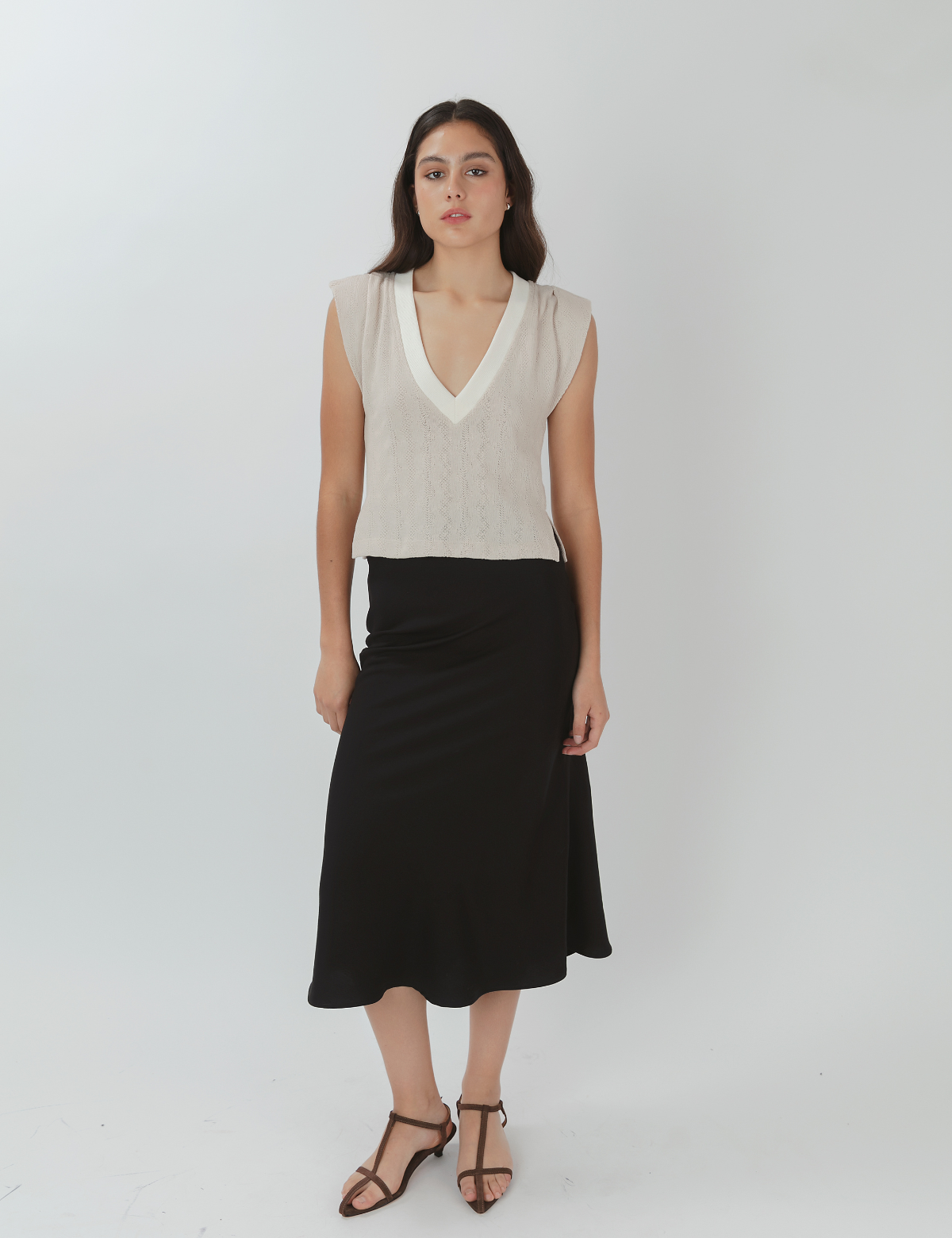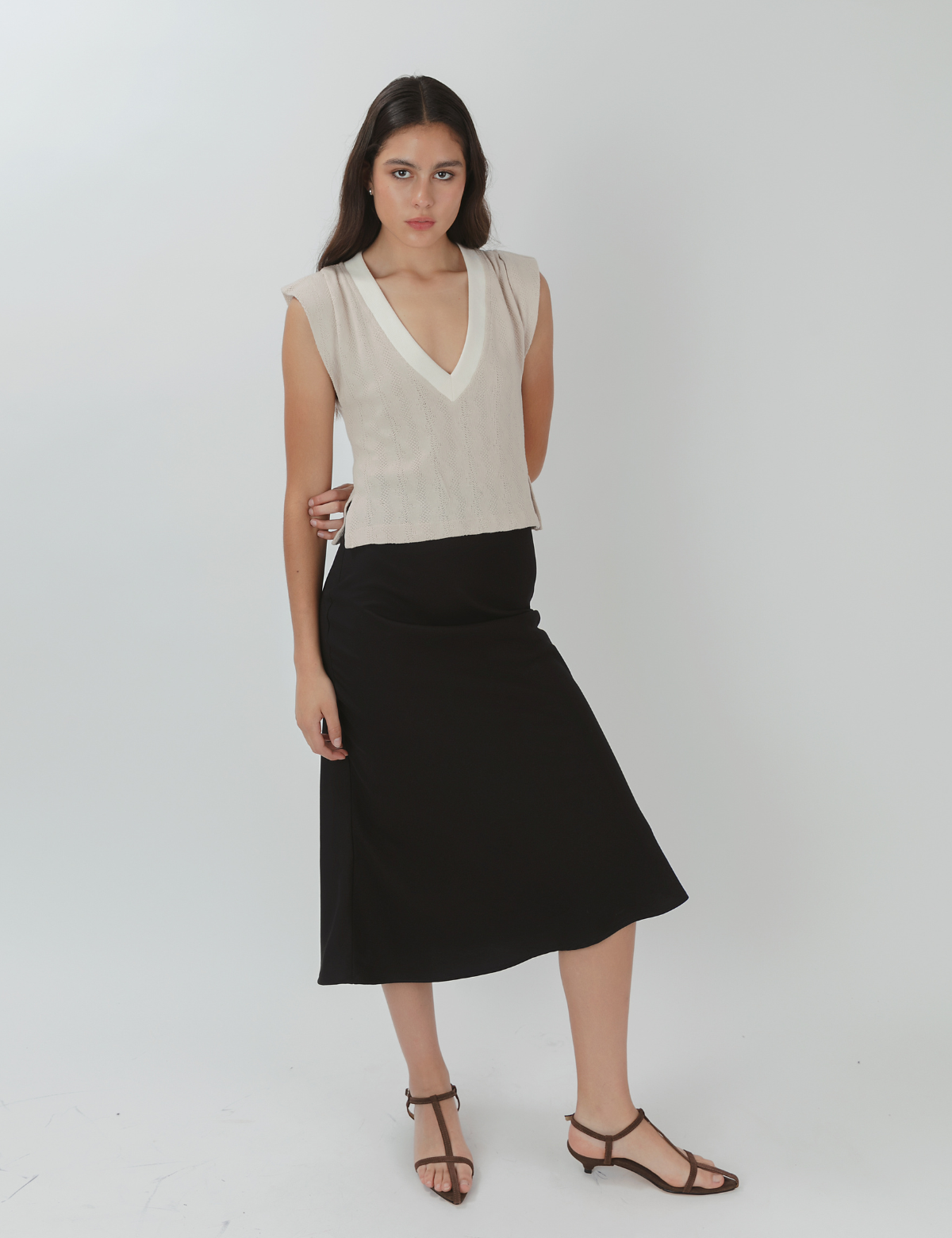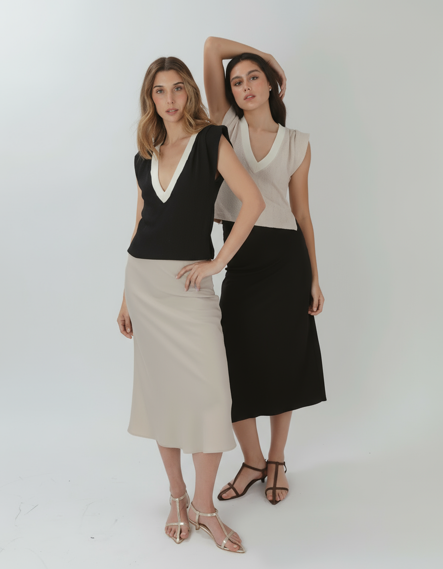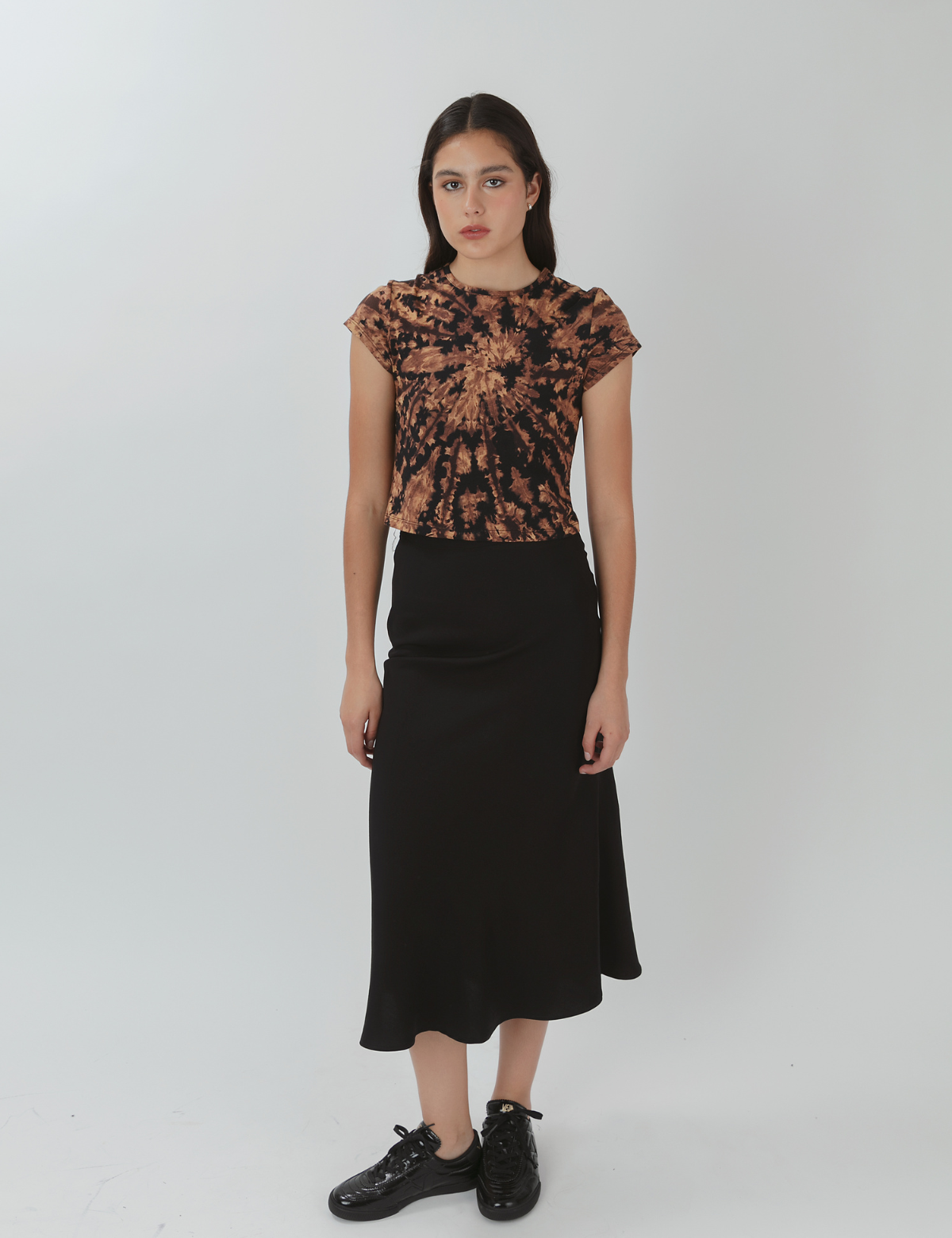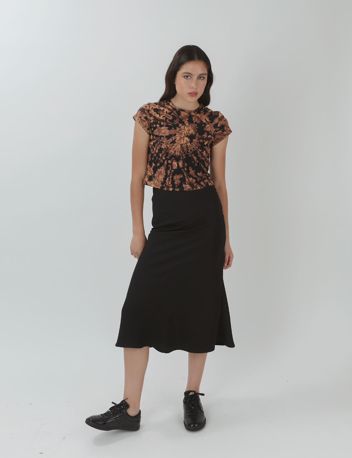 La falda Suri es una prenda de corte al sesgo y fabricada en un tencel de gramaje grueso y peso para así dar un movimiento espectacular en la silueta. Cuenta con una pequeña pretina de 2 cms y cierre al costado al tono.