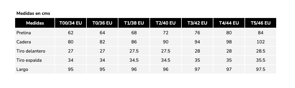 Calce: Skinny light, al cuerpo y a la altura de la pantorrilla relaja sin quedar ajustado en tobillos. Si lo prefieres mas relajado te recomendamos una talla más.