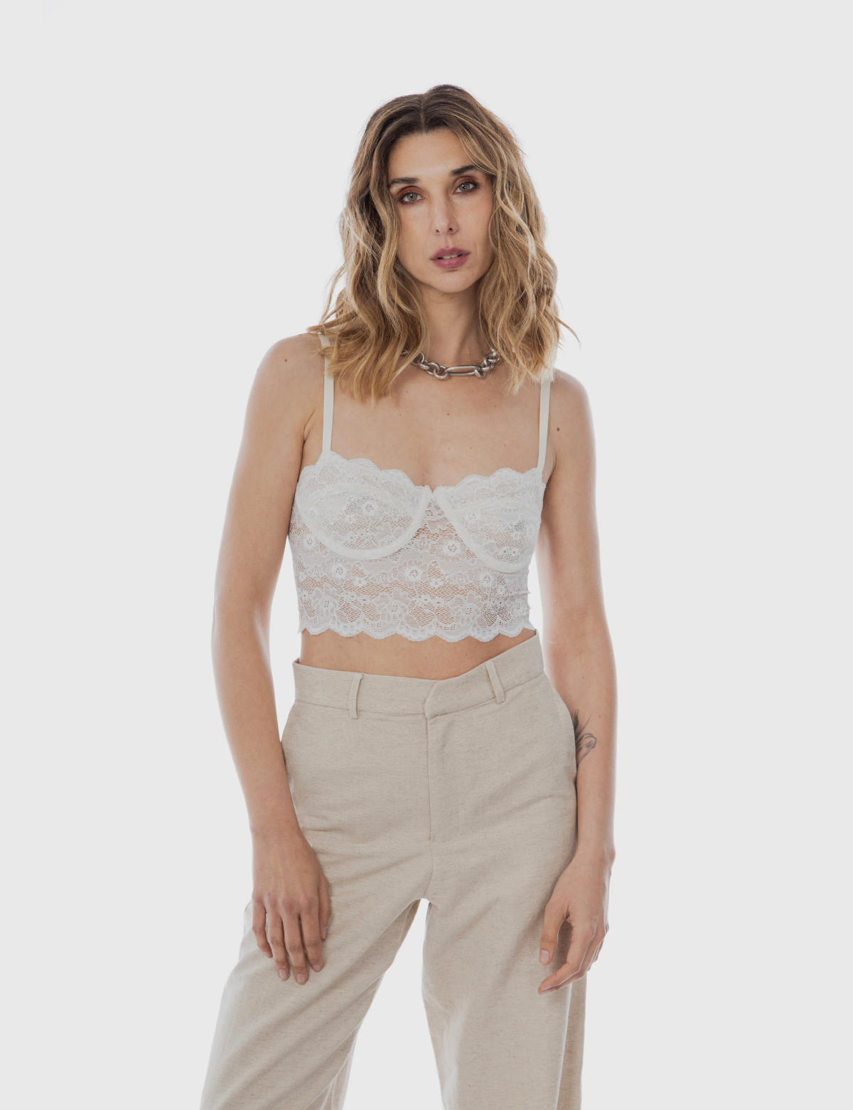Peto Karyn Coo confeccionado en encaje elástico crudo.