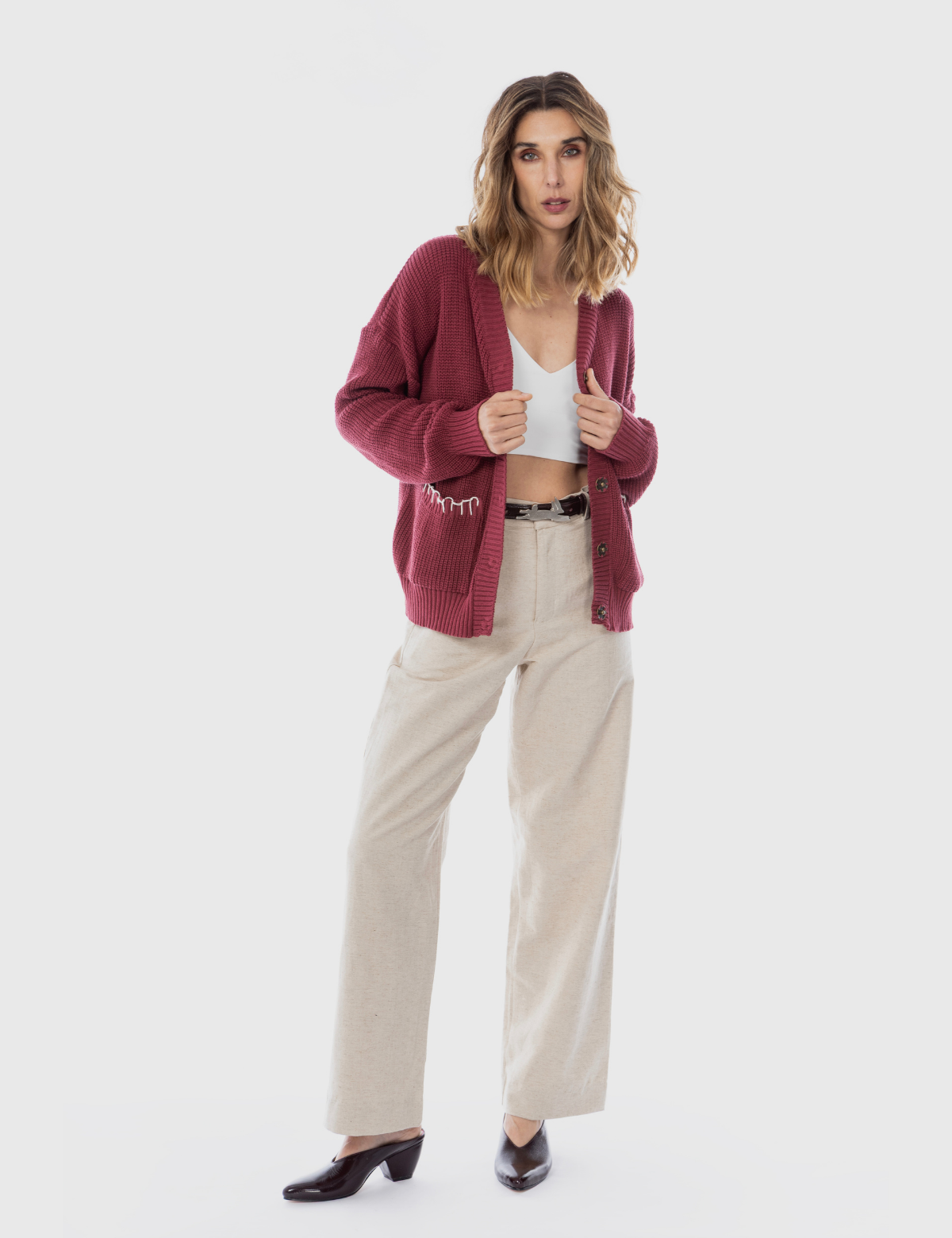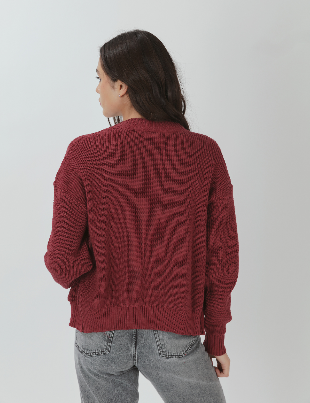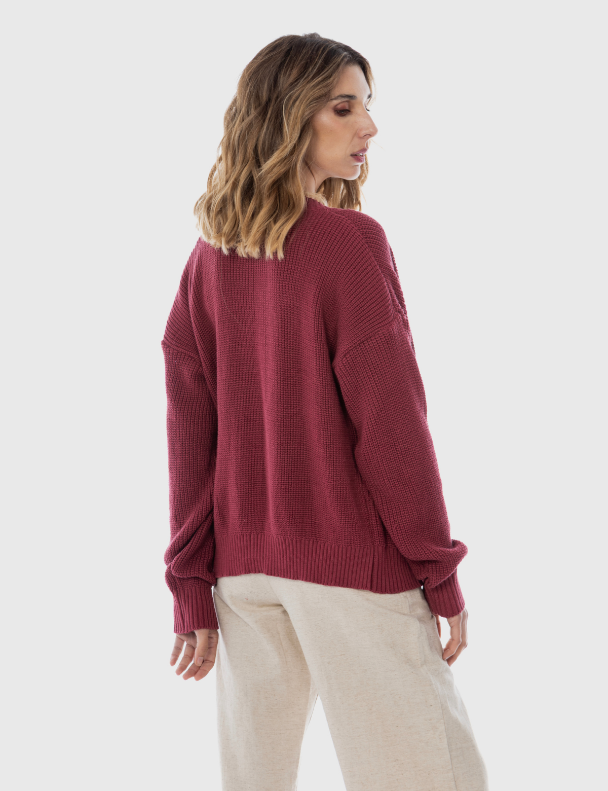 • Tejido plano grueso con rib en puños, basta y borde frontal.