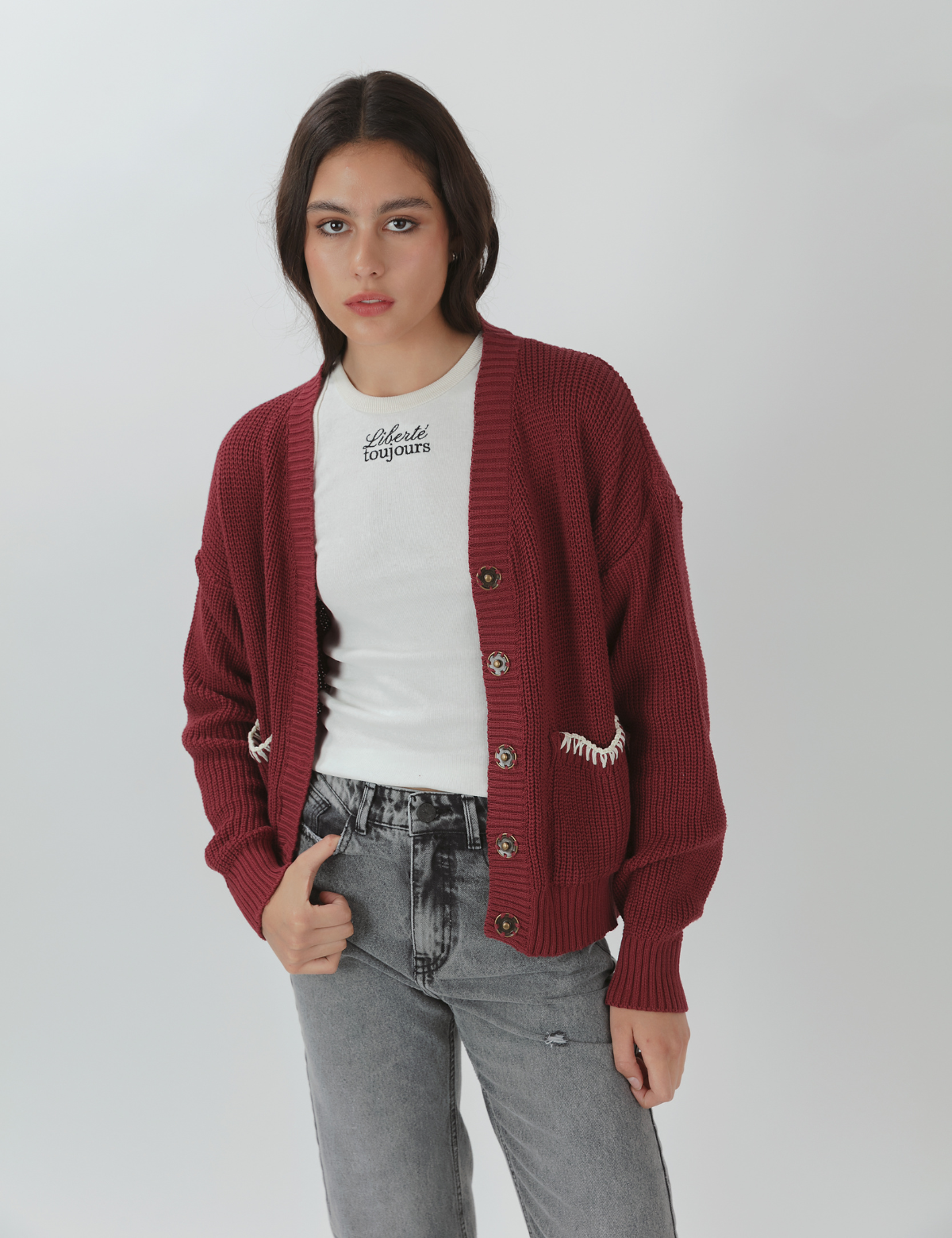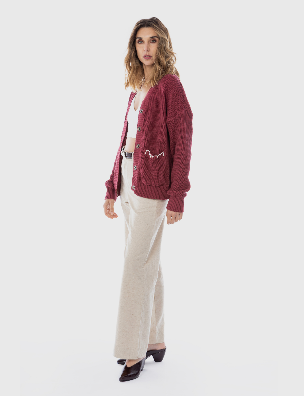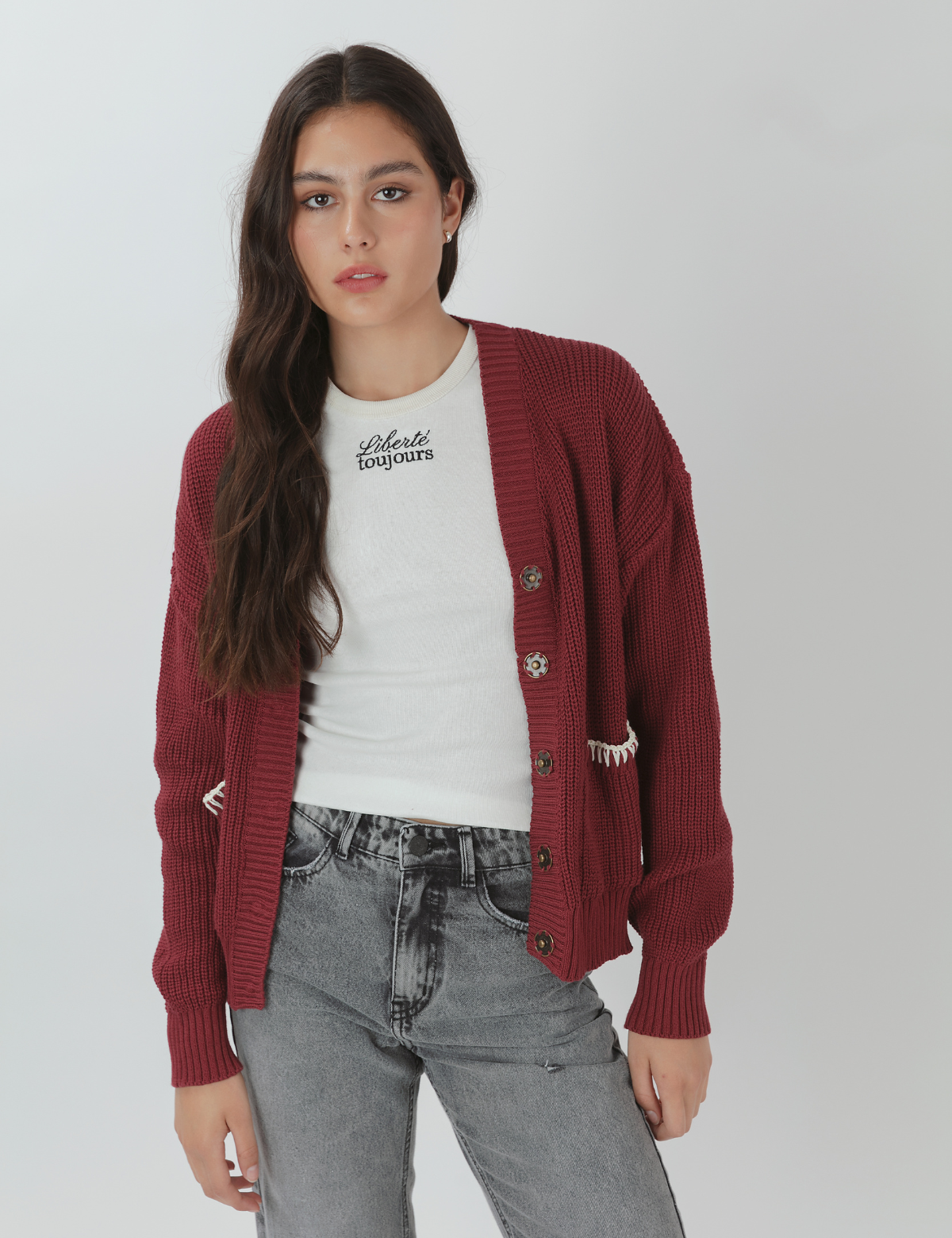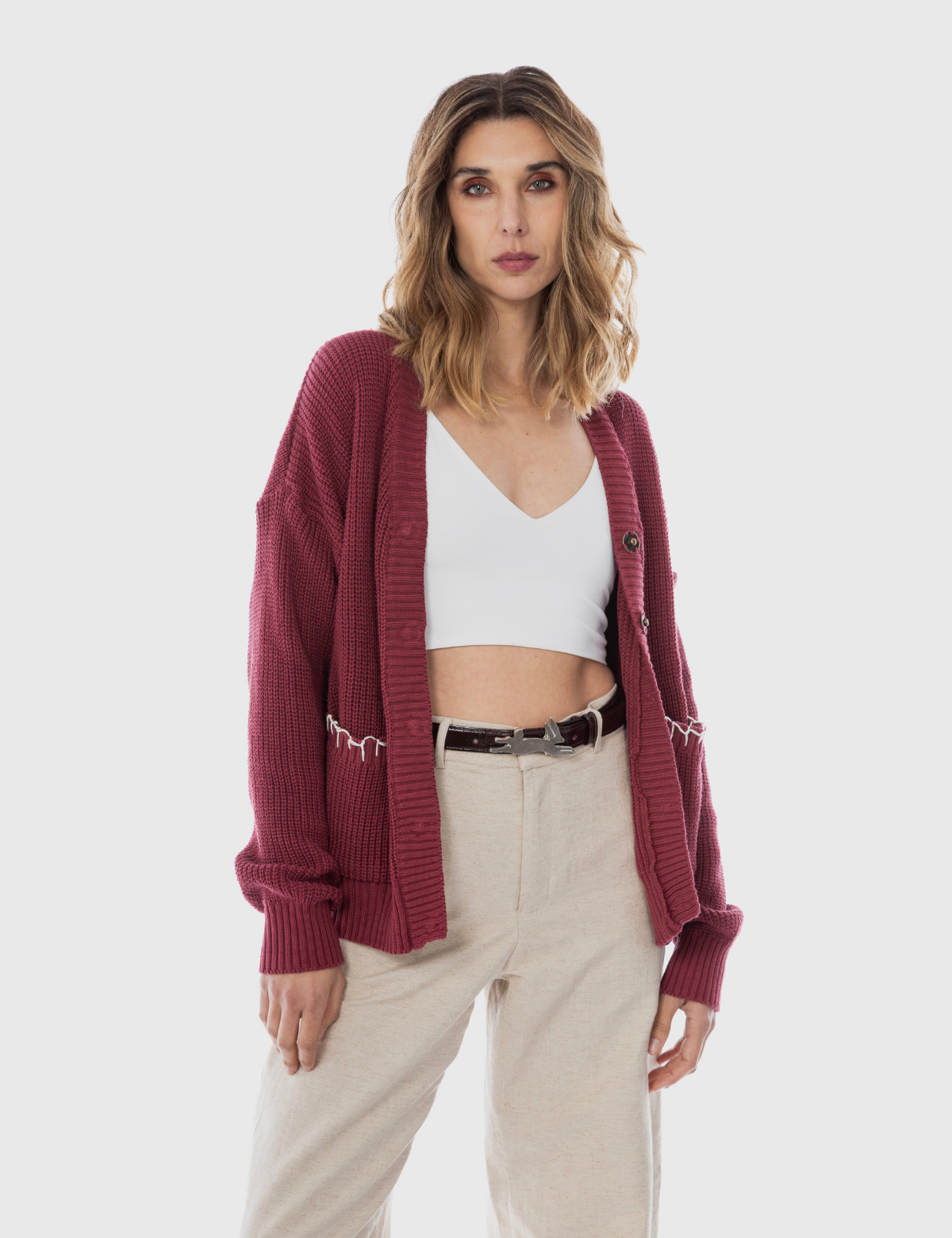 • Cuello en “V” y botonadura frontal con broches metálicos envejecidos.