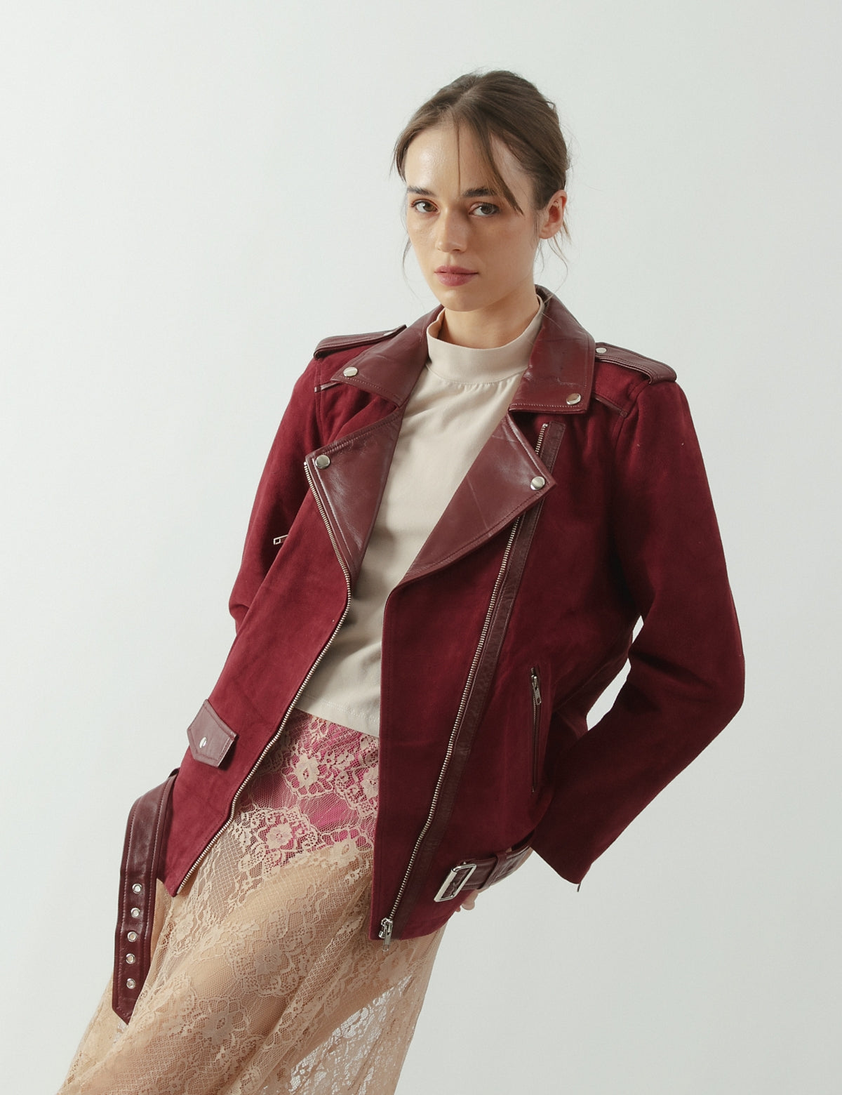• Confeccionada en gamuza natural color burdeo, de textura suave y acabado aterciopelado.