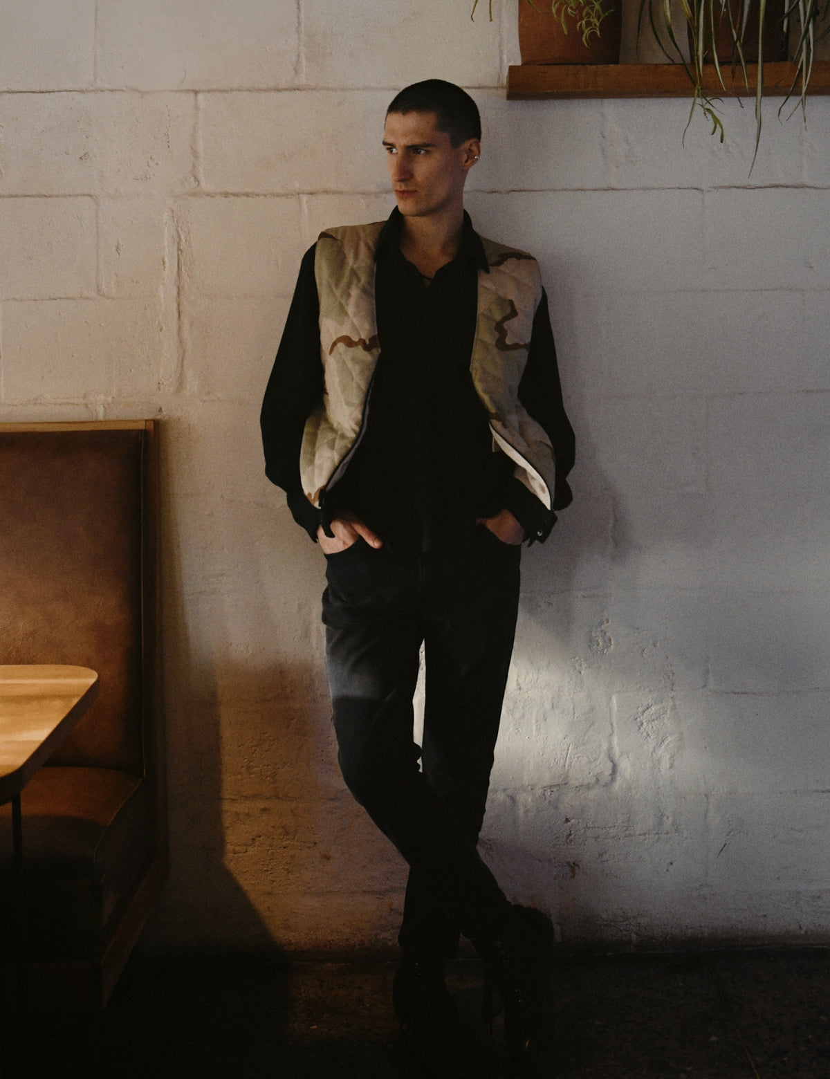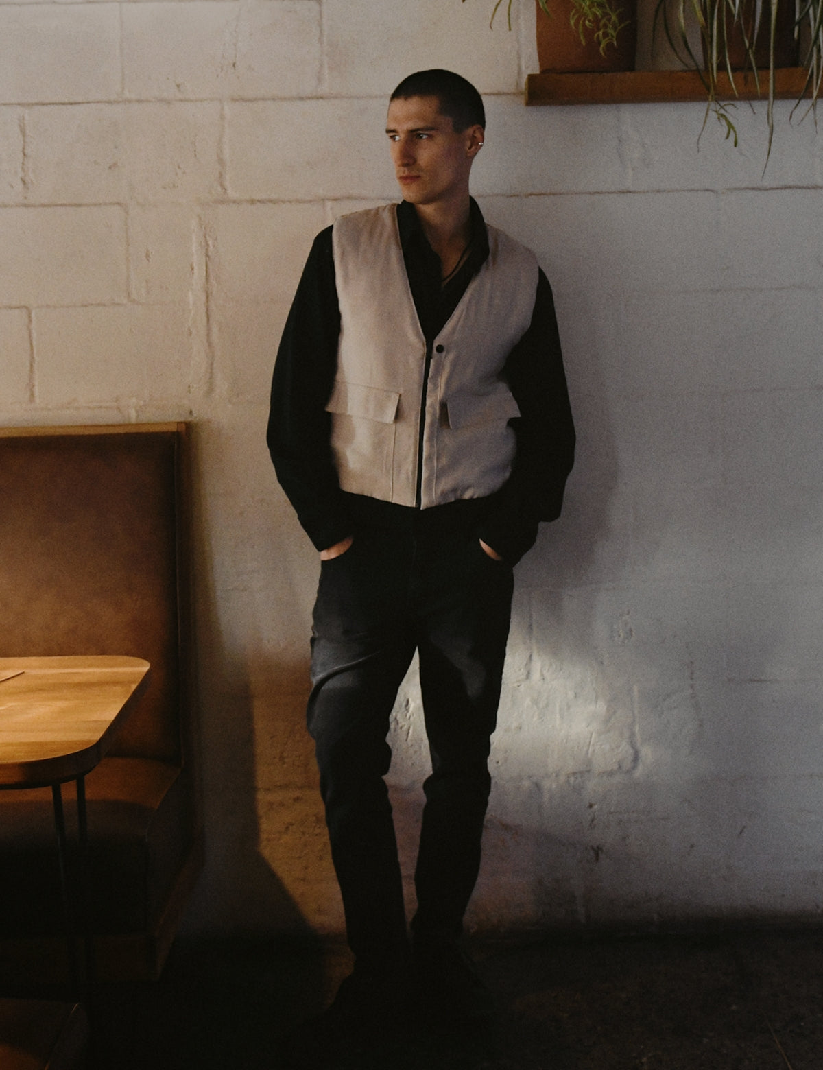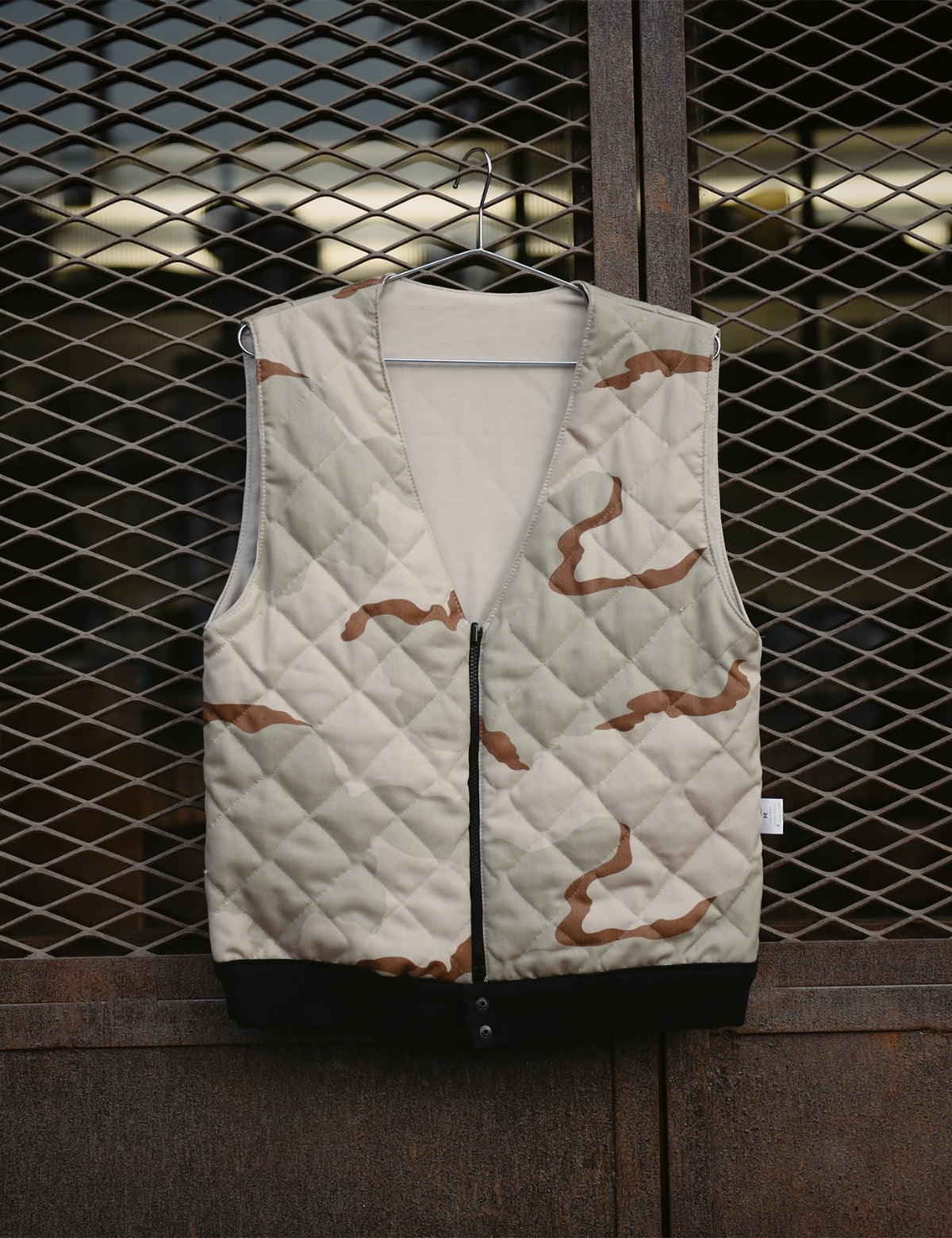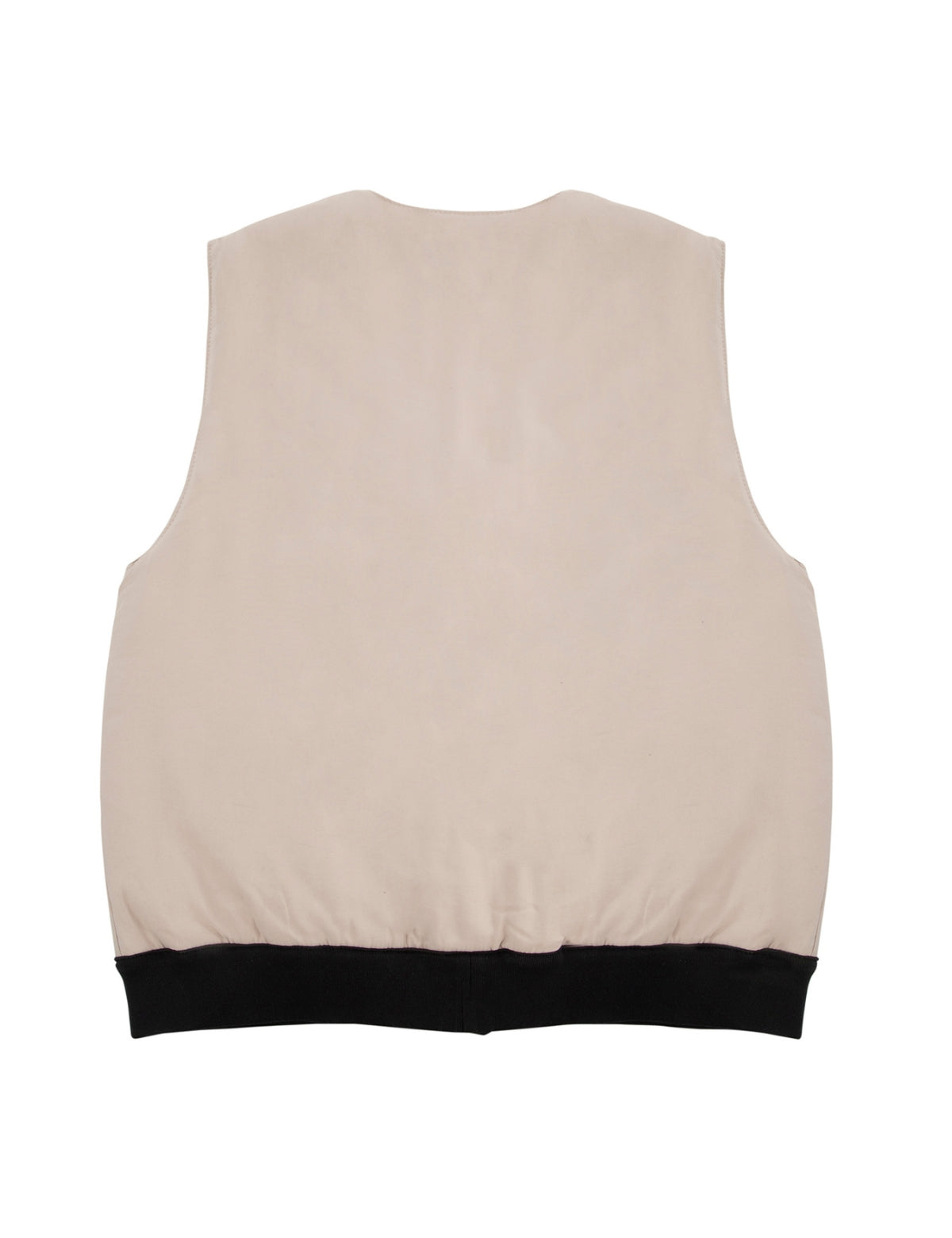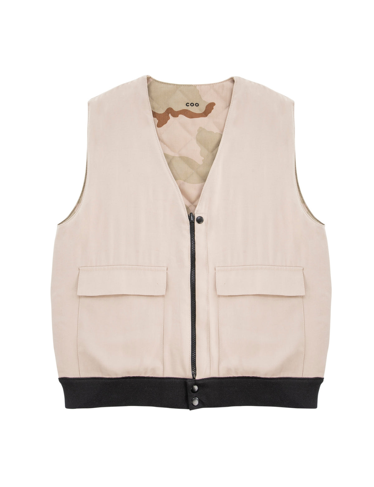 Chaqueta fabricada en tencel beige con bolsillos frontales tipo parche y cierre frontal de diente de perro en color negro, pretina en rib con elastico interior y forro acolchado camuflado. En su interior cuenta con el logo bordado en color negro.