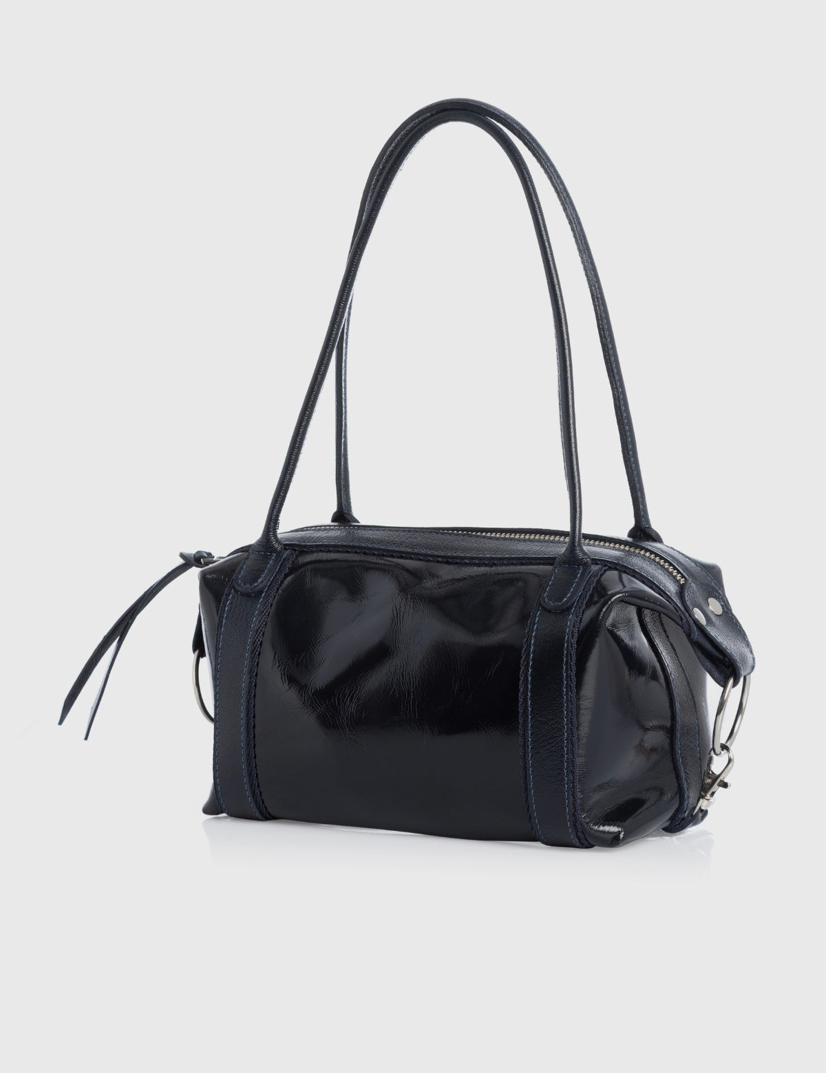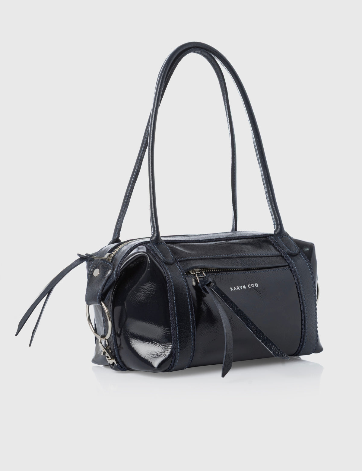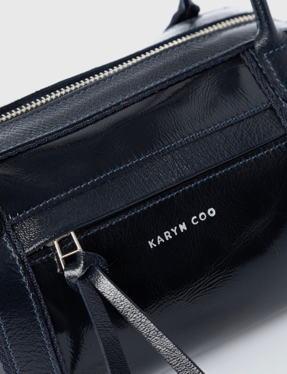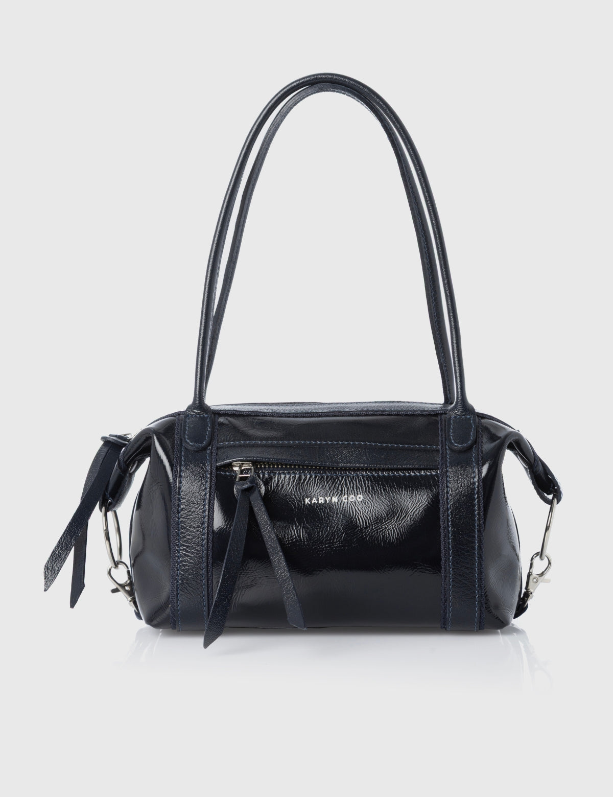 Cartera pequeña estructurada Karyn Coo en acabado charol color marino.