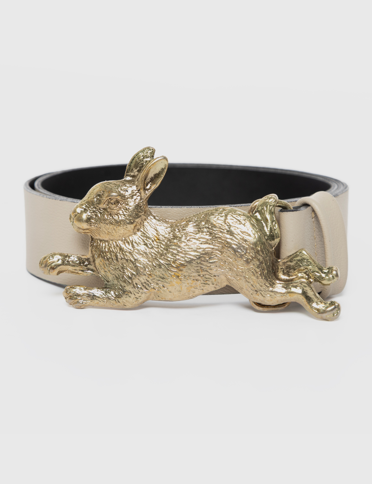 • Hebilla metálica en forma de conejo, terminación oro brillante.