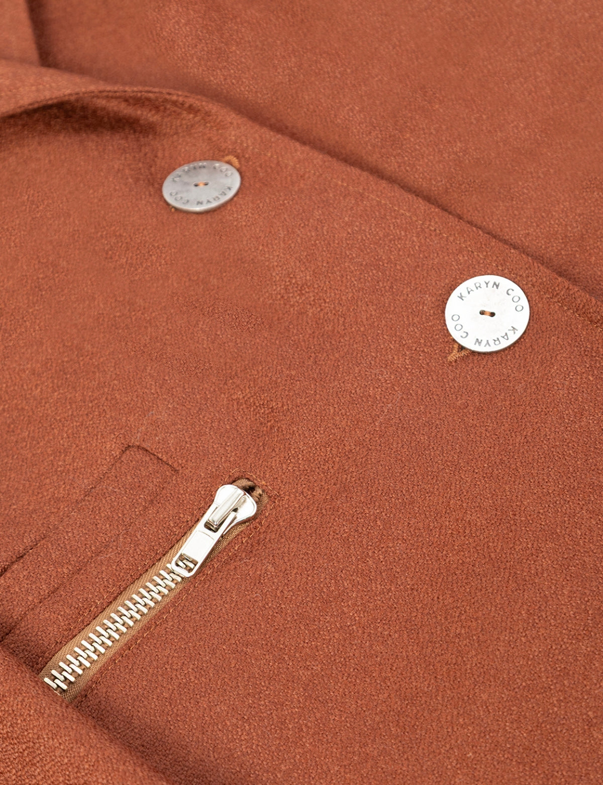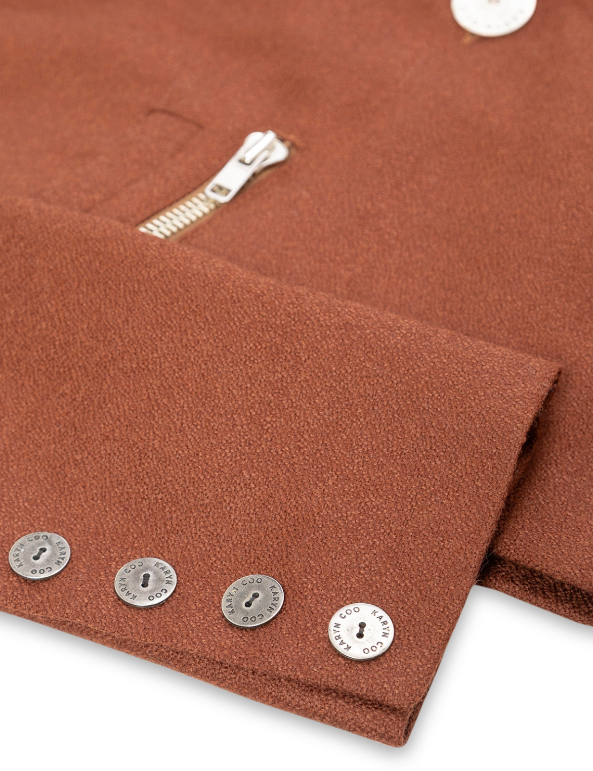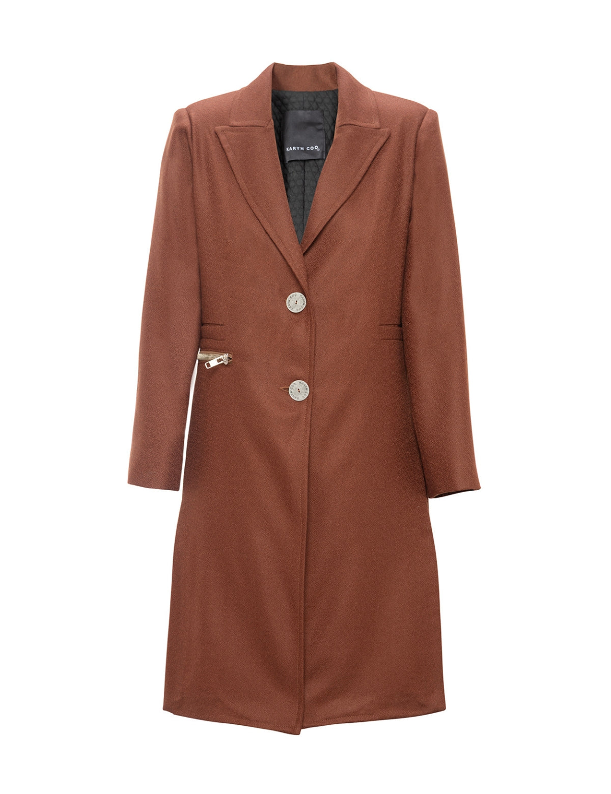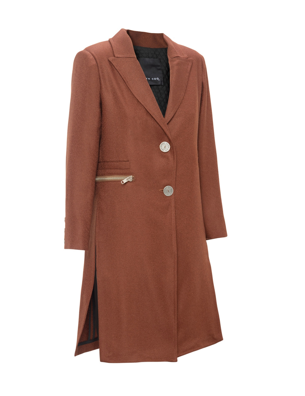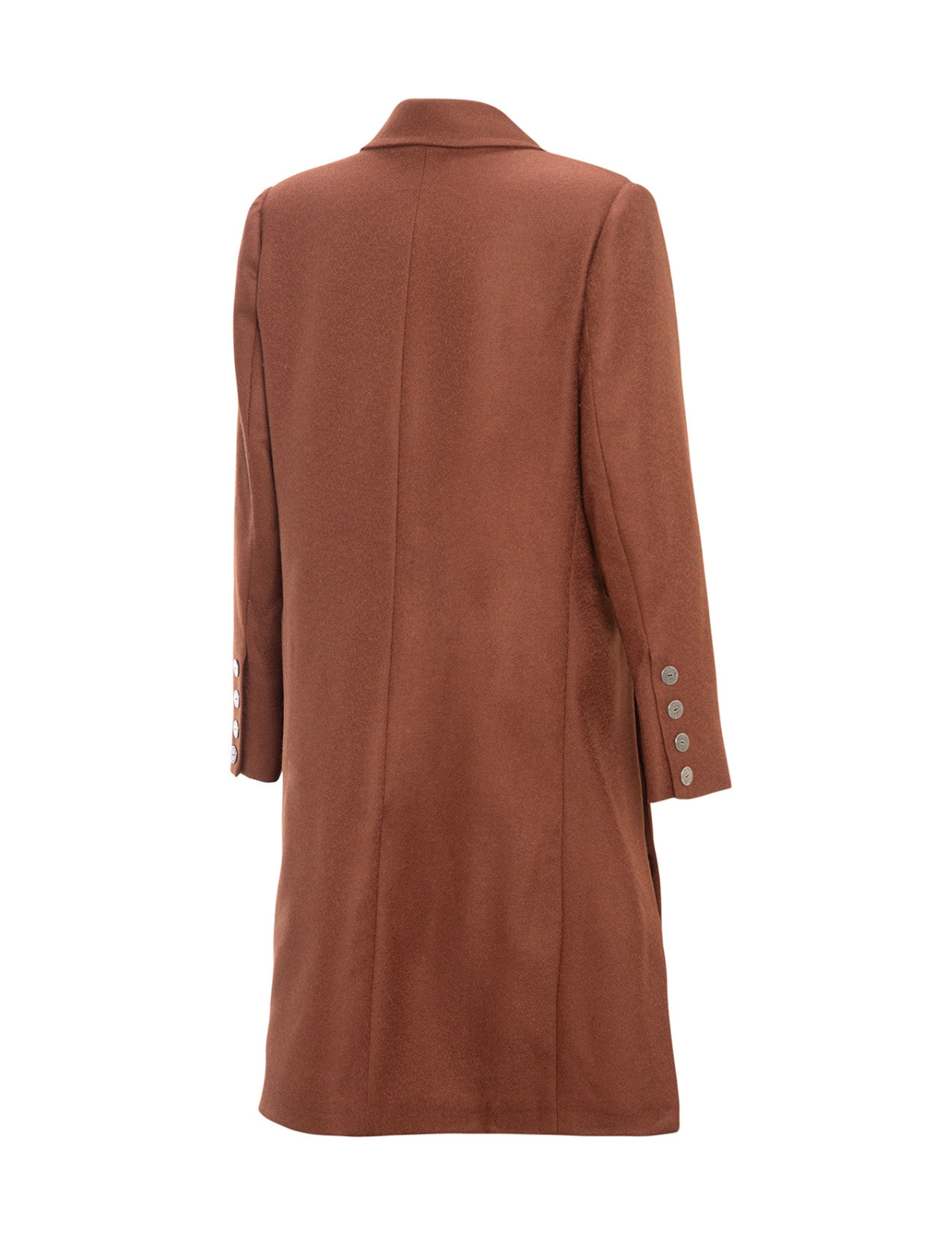 El abrigo Muka es un diseño que nos encanta y seguimos incluyendo en nuestras colecciones por su corte atemporal. Con estructura en la parte superior y solapas en punta de corte recto y apertura en cada costado de manera exagerada para darle movimiento y también deja ver la construcción interna de la prenda. Cuenta con botones metalizados, bolsillos de costado escondidos y de manera ornamental bolsillos frontales tipo ojal.