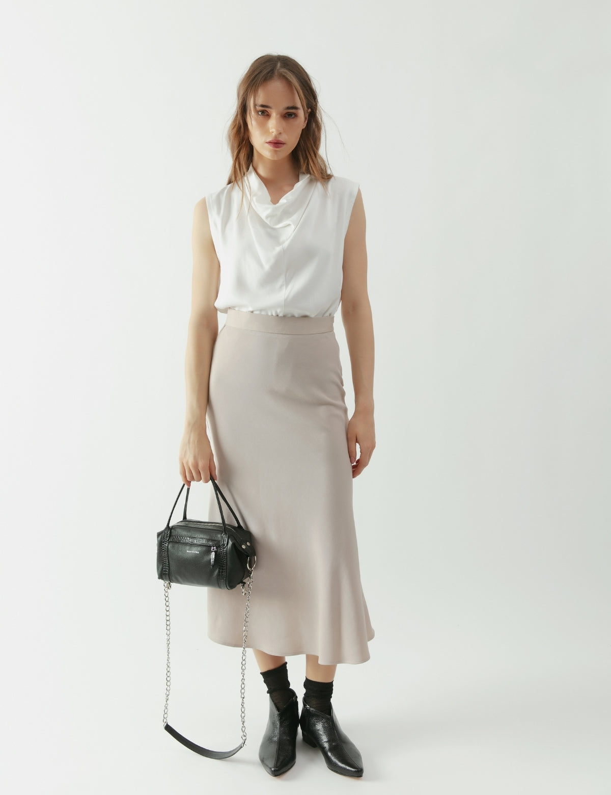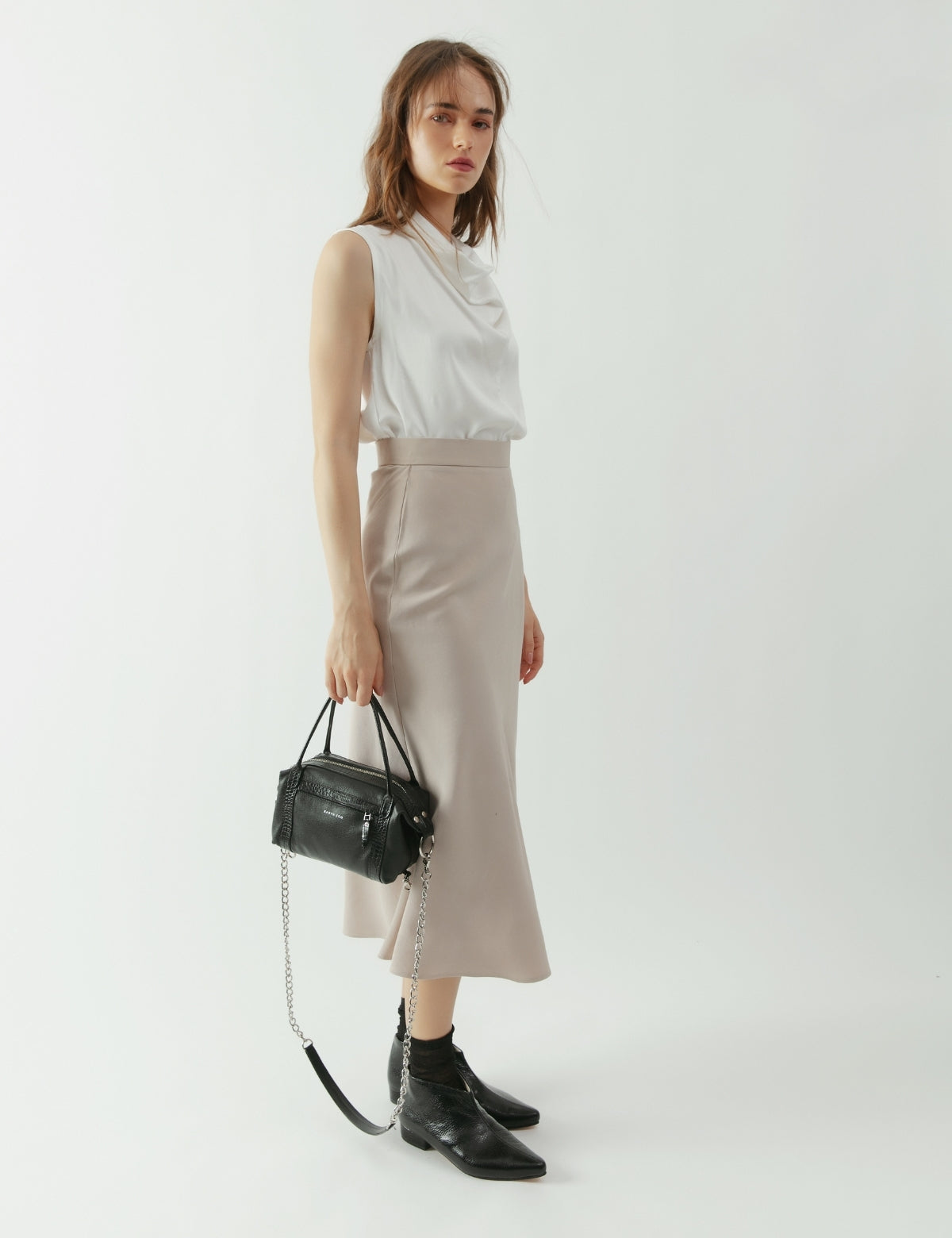 La falda Suri es una prenda de corte al sesgo y fabricada en un tencel de gramaje grueso y peso para así dar un movimiento espectacular en la silueta. Cuenta con una pequeña pretina de 2 cms y cierre al costado al tono.