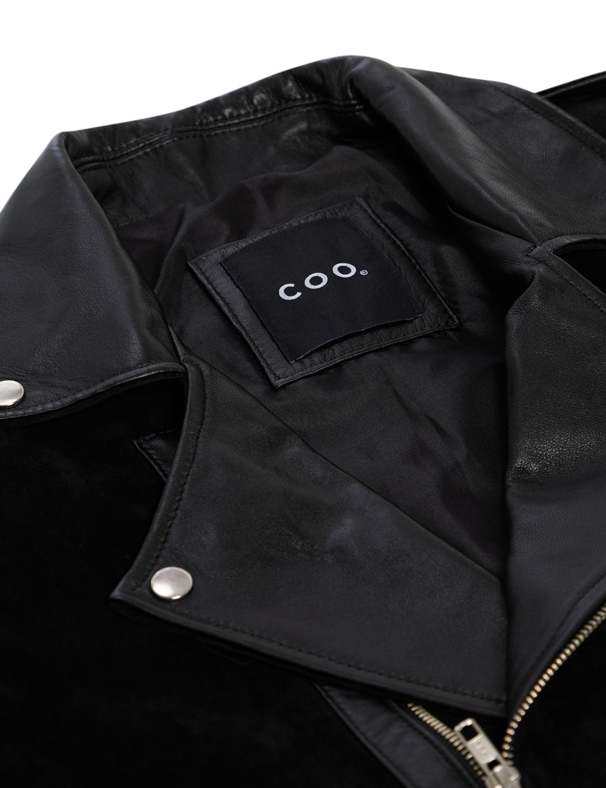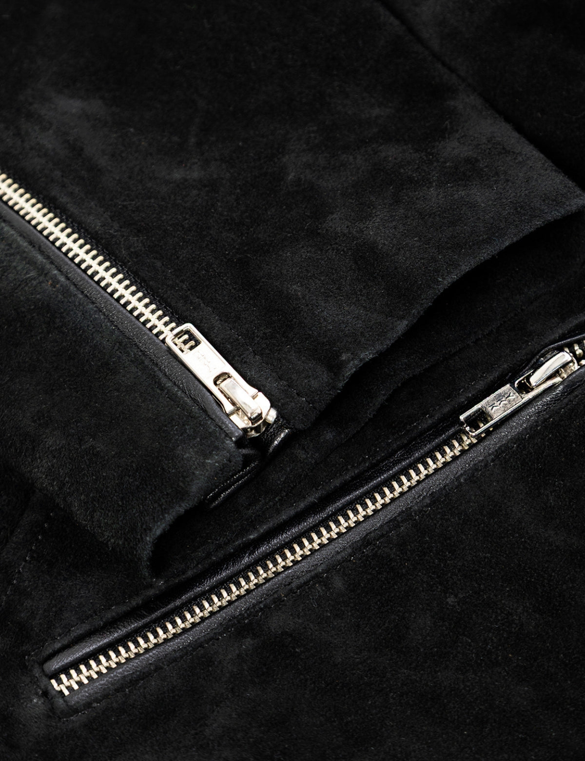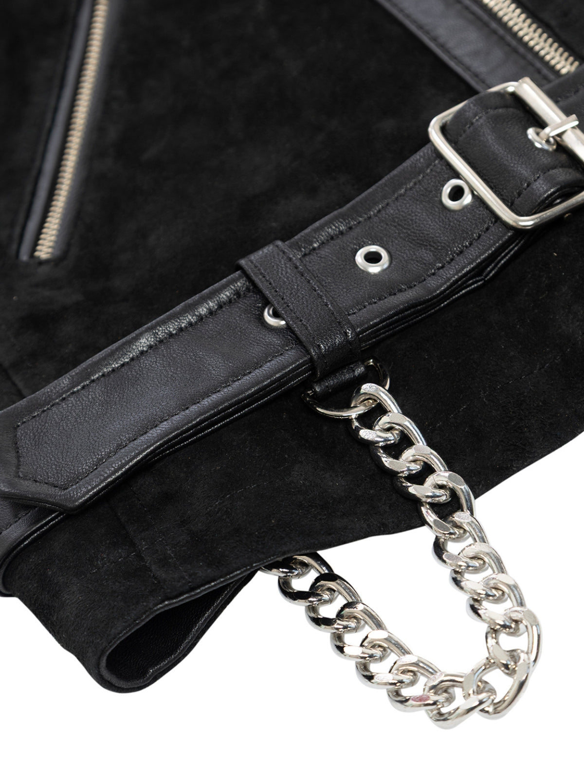 Chaqueta estilo biker confeccionada en gamuza de cuero 100% natural color negro. Presenta solapas amplias en cuero liso con botones a presión, cierres metálicos en níquel en abertura frontal asimétrica, bolsillos y puños. Incluye cinturón ajustable en cuero liso con hebilla metálica y detalle de cadena lateral. Forro interior liso al tono para mayor confort. Herrajes y cierres de alta resistencia para un look duradero y atemporal.