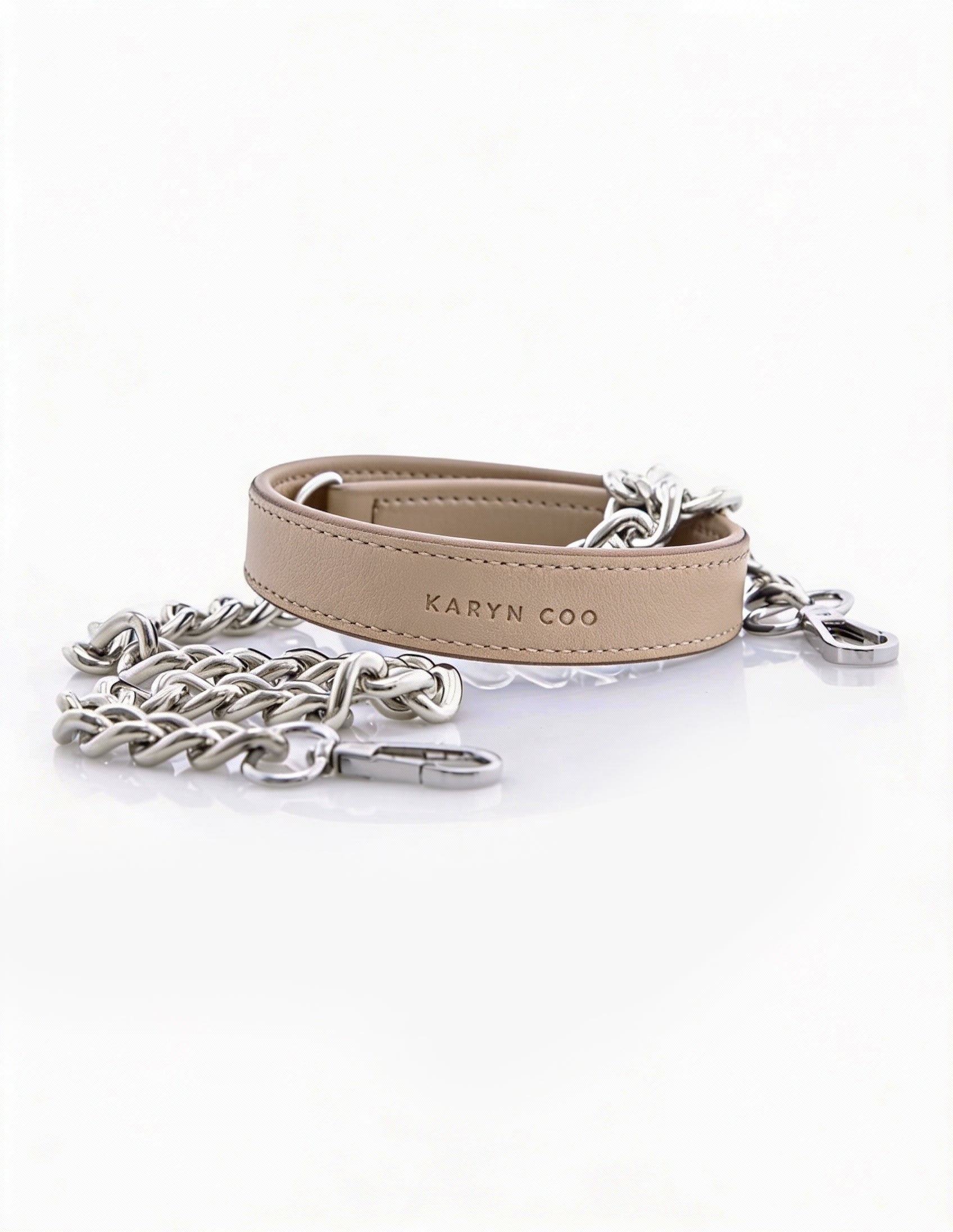 Accesorio de cadena resistente y gruesa en color niquel con tomadera de cuero en relieve en cuero.