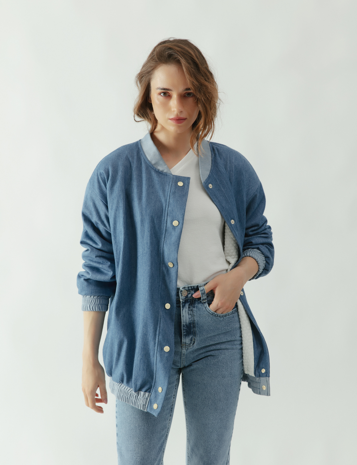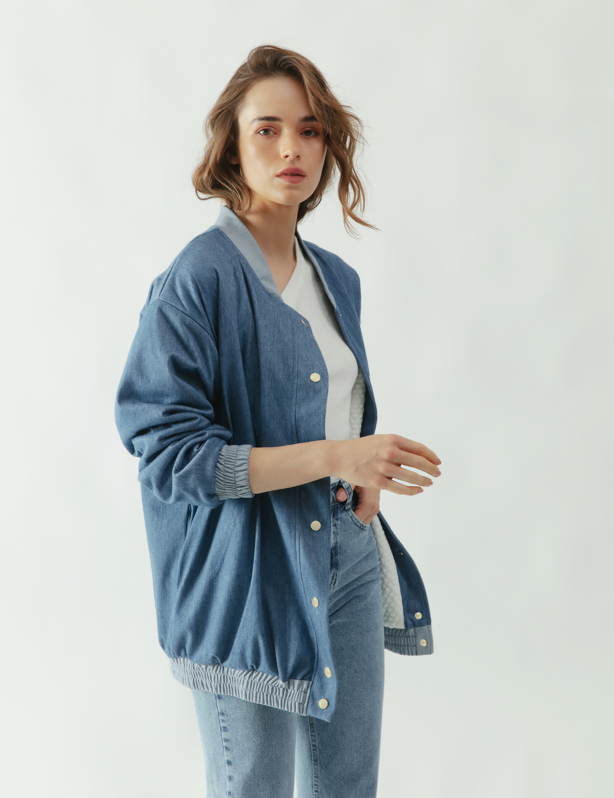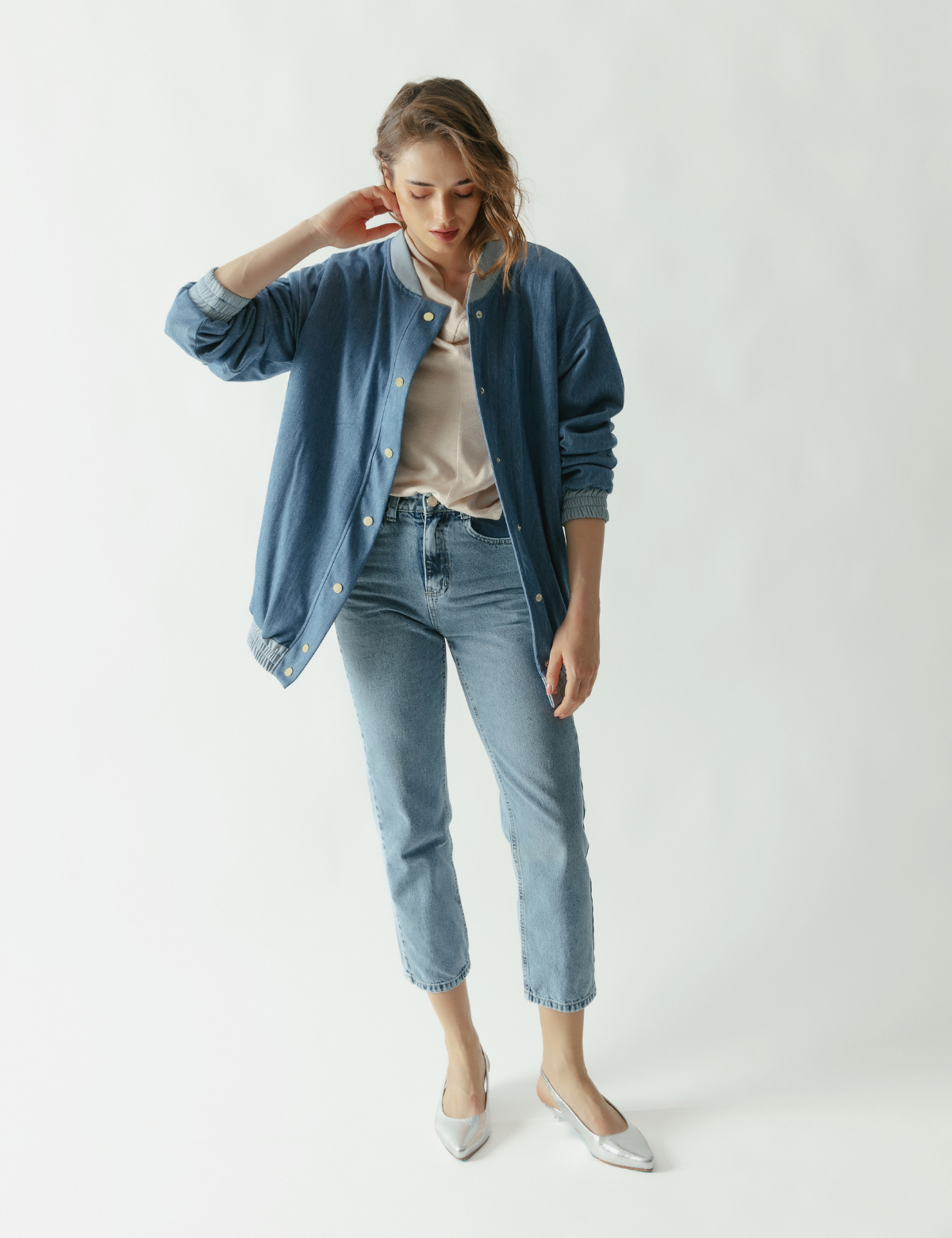 • Confeccionada en look denim liviano, con caída fluida y textura suave.
