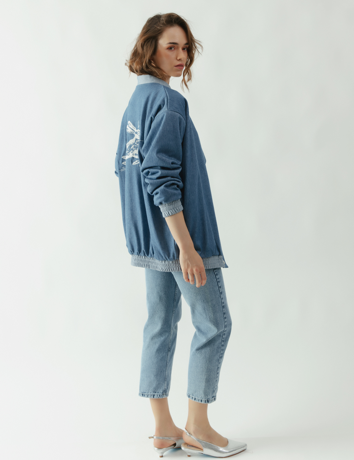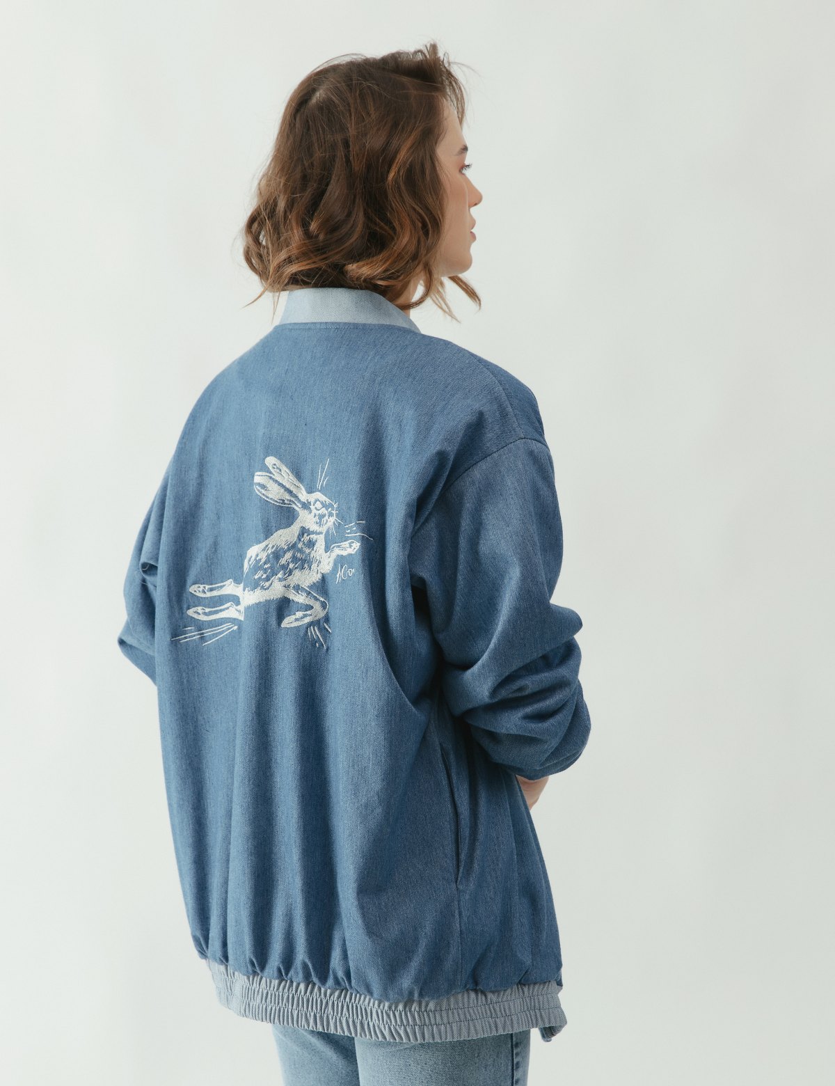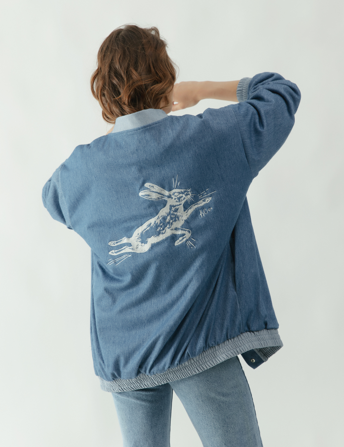 • Bordado de conejo saltando estampada en la espalda, ícono distintivo de la colección.