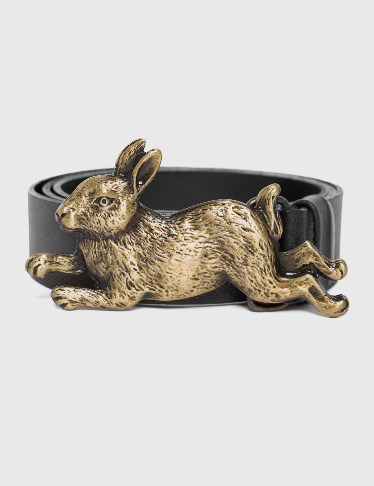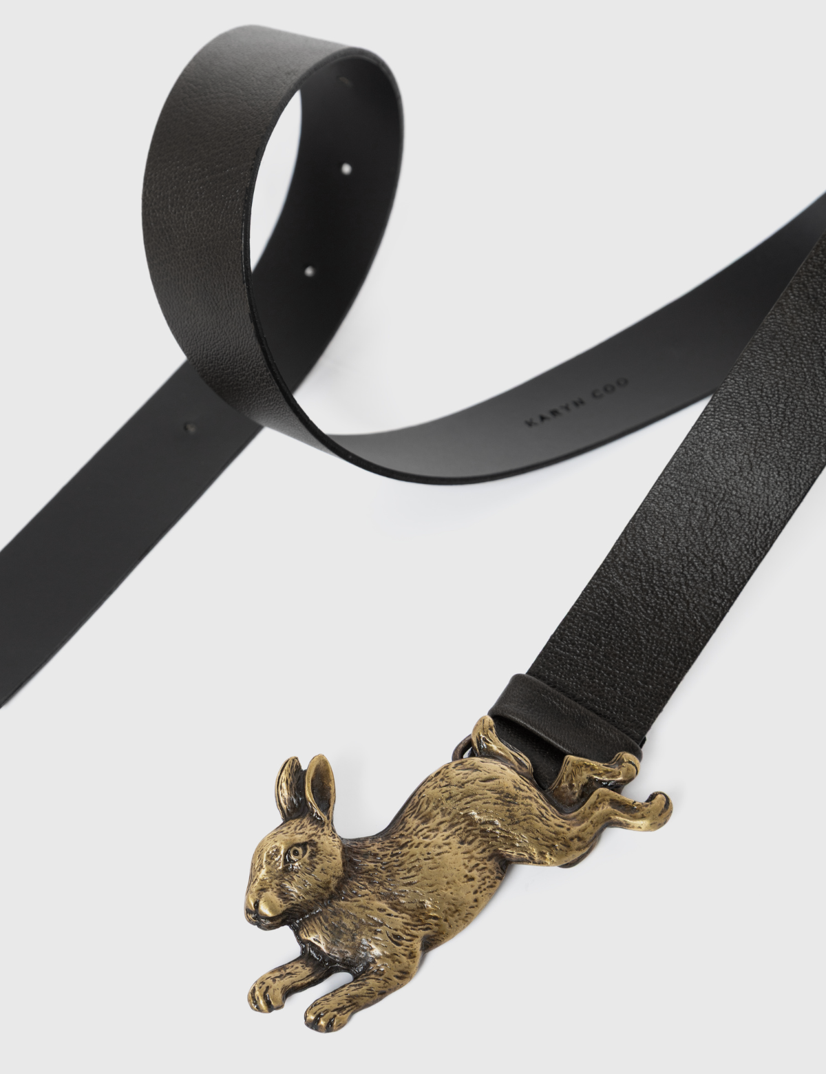 • Hebilla metálica en forma de conejo, terminación oro desgastado.