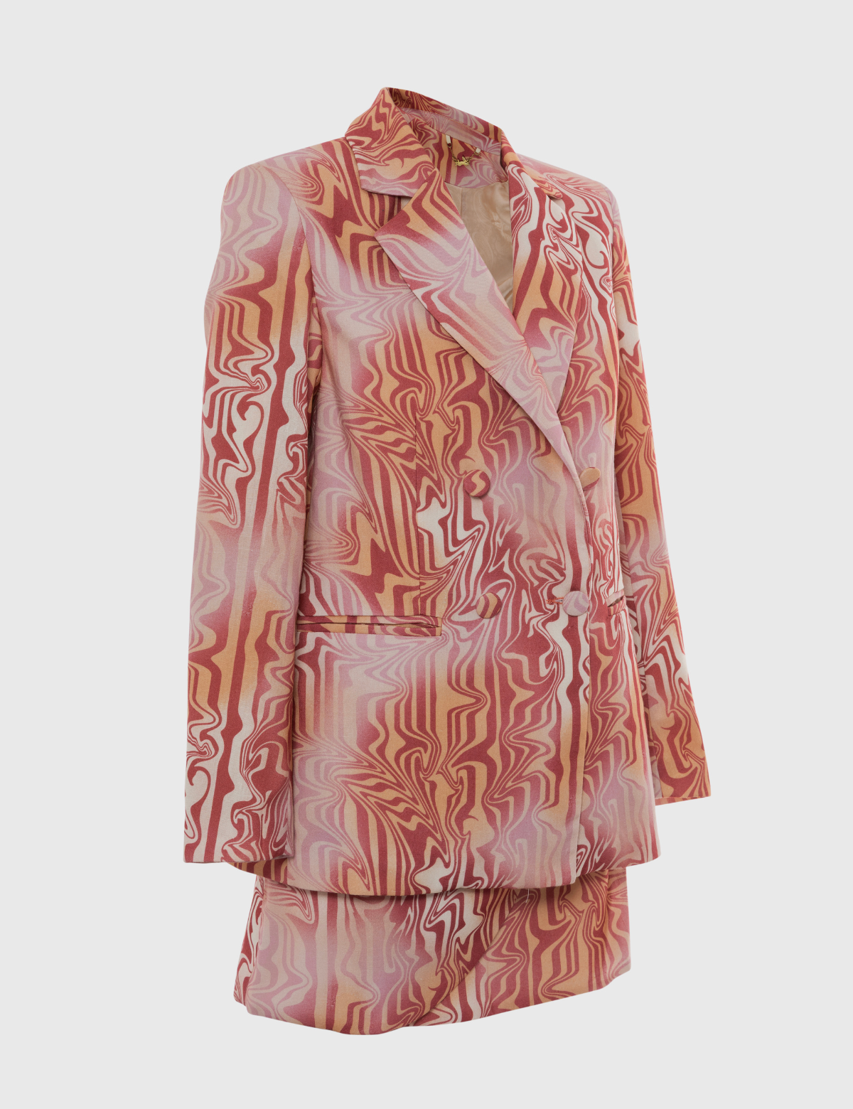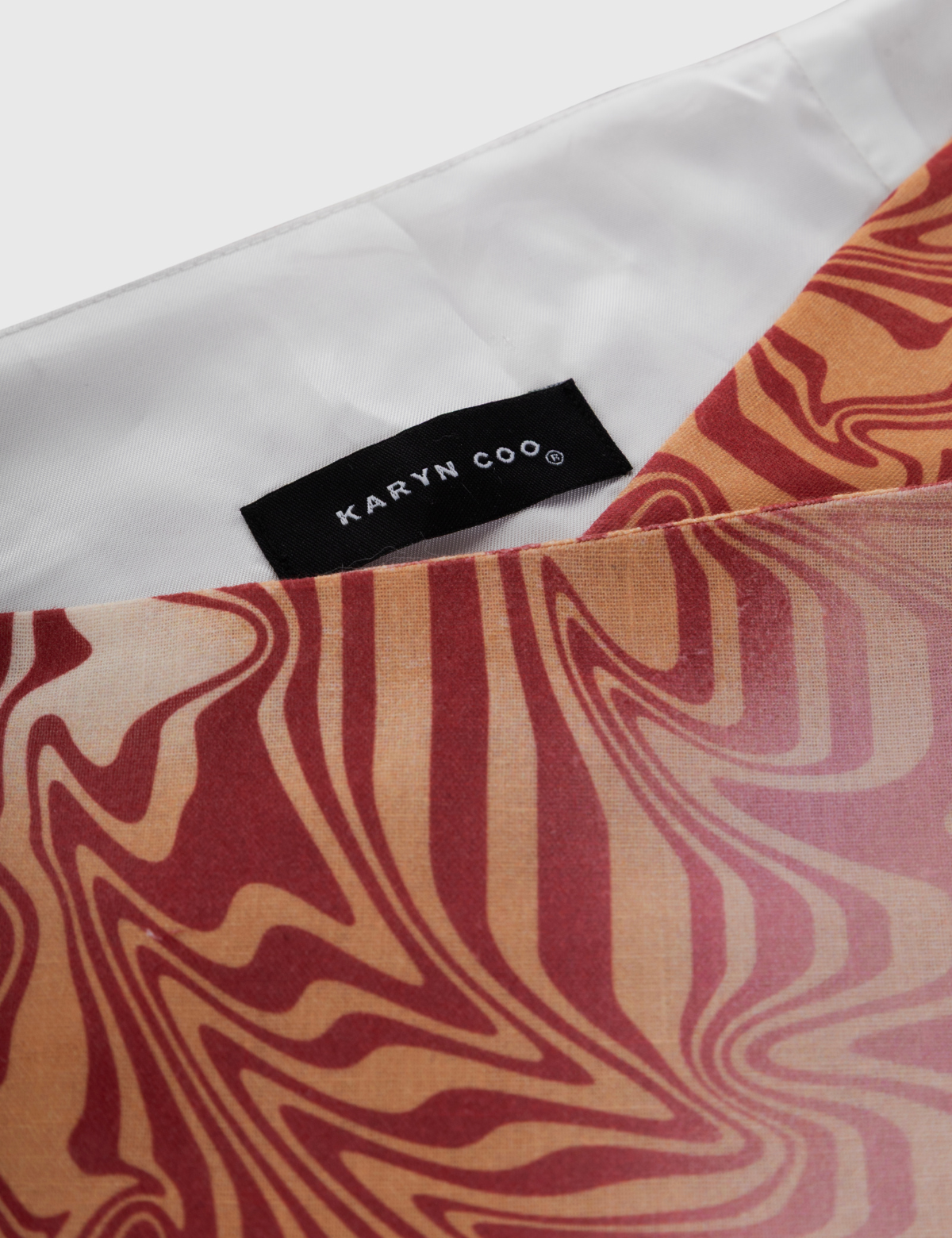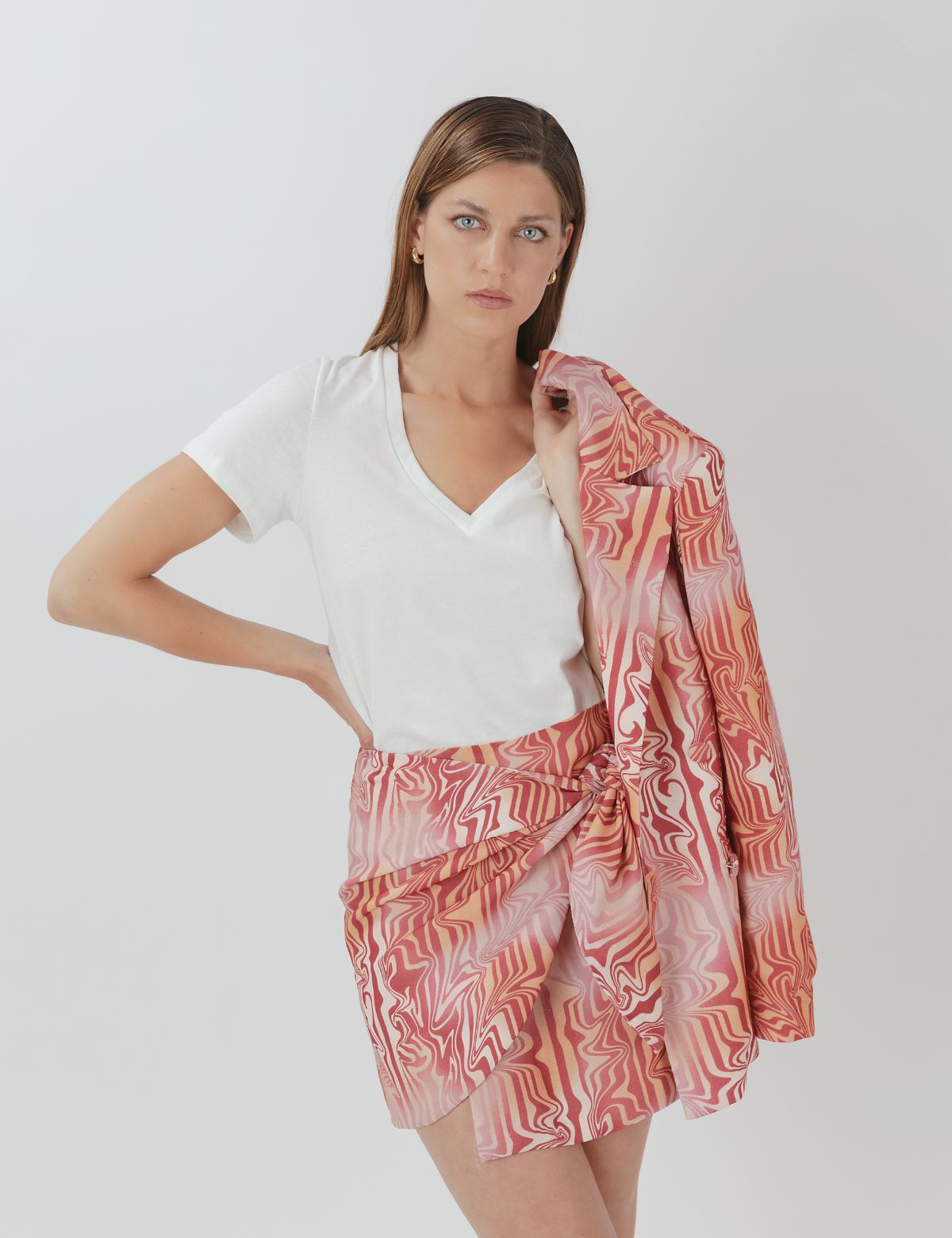 Mini falda Karyn Coo confeccionada en viscosa ligera estampada con motivo psicodélico en tonos cálidos.