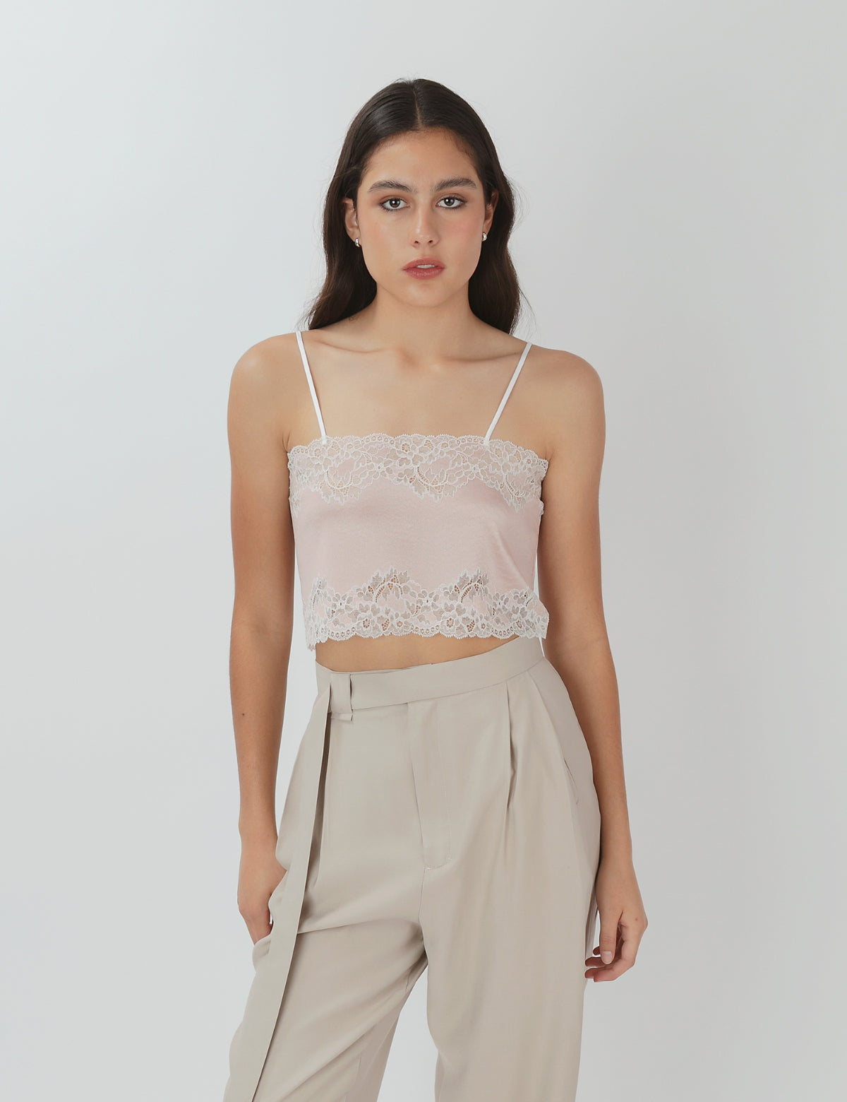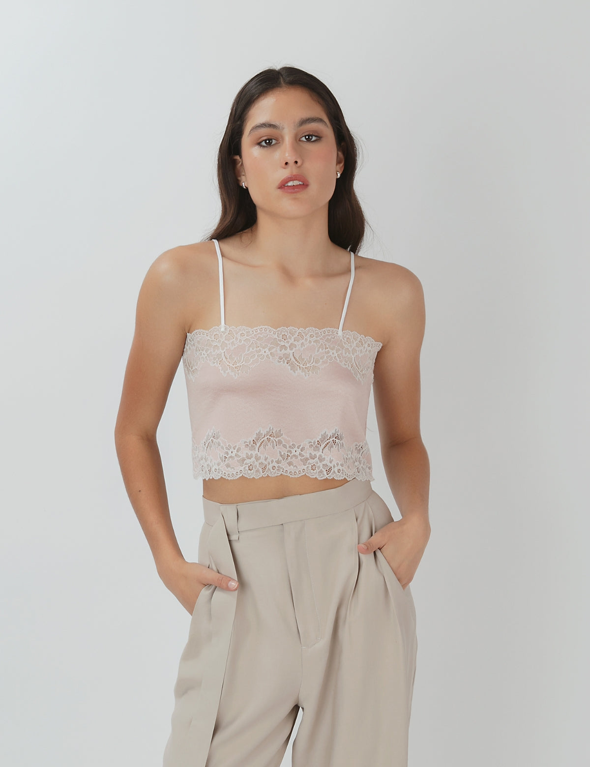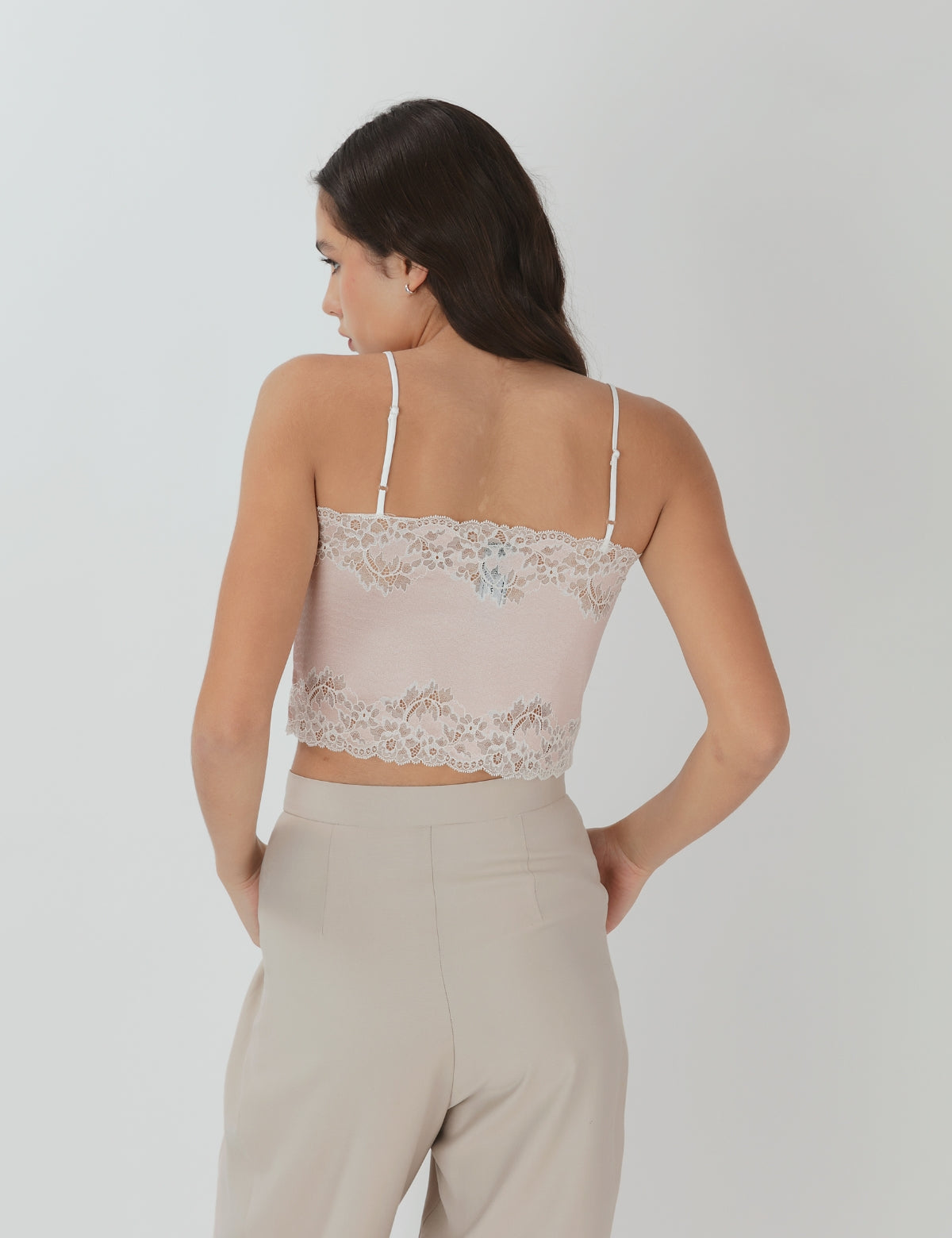 • Base nude suave con encaje blanco superpuesto en todo el contorno.